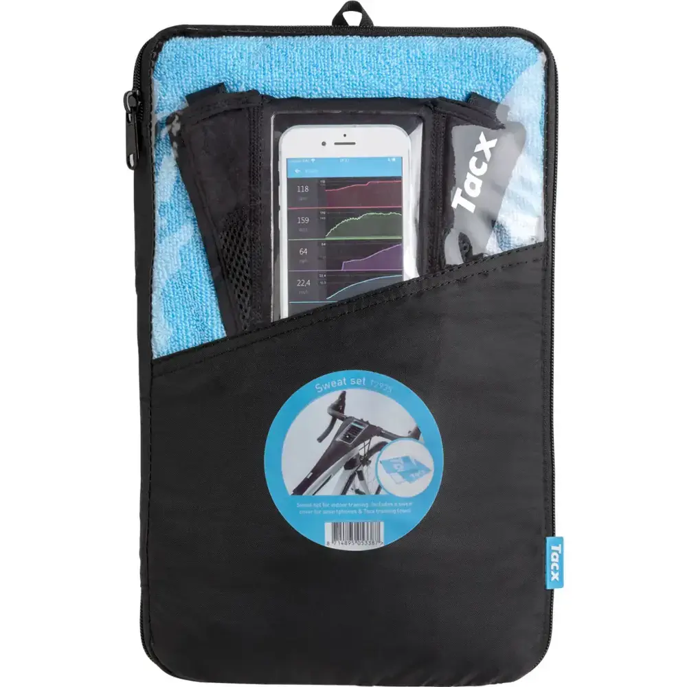 Binnen trainen betekent onherroepelijk veel zweten, deze set bevat alles wat je nodig hebt om je fiets te beschermen en jezelf comfortabel te houden. De set bestaat uit een handige zweethoes voor je smartphone. Deze hoes beschermt je fiets tegen je transpiratievocht en geeft toegang tot je smartphone. Het is gemaakt van absorberend materiaal en voorzien van een doorzichtig vak voor je telefoon, zodat je display zichtbaar is. De sweatguard past op de meeste fietsen en het smartphonevak is geschikt voor telefoons met maximale afmeting van 138 x 68 mm (LxB). Daarnaast zit er een Tacx handdoek in deze set. Deze is speciaal ontwikkeld voor indoor trainingen en wordt ook door pro’s gebruikt bij hun warming-up en indoortrainingen. De handdoek is 30 x 115 cm en absorbeert uitstekend.