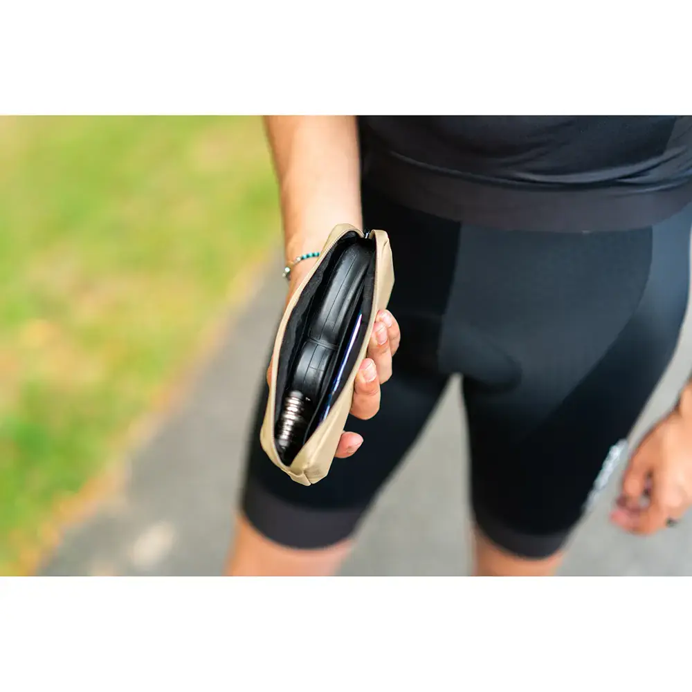 De naam verteld eigenlijk al waar je de Essentials Case van The Pack voor kunt gebruiken. Het is een handig tasje om al je essentials in te bewaren. Dankzij de afmetingen past hij perfect in de achterzakken van een standaard fietsshirt met drie zakken. De case heeft verschillende vakjes om alles geordend te bewaren. Denk aan een vak voor geld, voor pasjes, een telefoonhouder en een groot vak voor klein fietsgereedschap als een multitool, een binnenbandje, bandenlichters en een co2 patroon en co2 pompje (niet allemaal tegelijkertijd, zie afmetingen). De telefoonhouder is extra stevig en ook geschikt voor grotere smartphones. Ideaal als je je telefoon wilt beschermen tegen krasjes, water en zout.