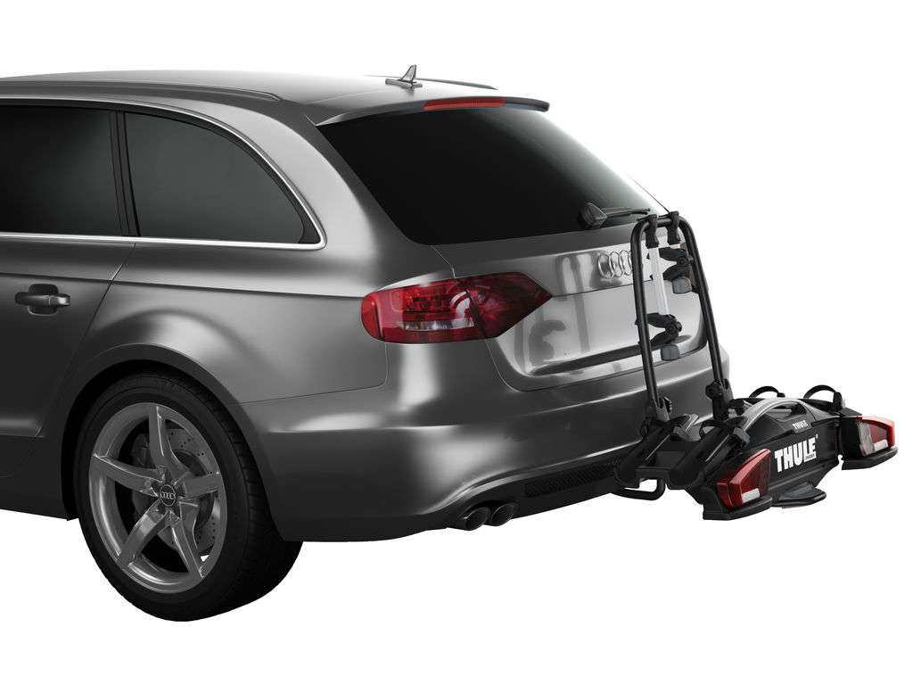 De Thule VeloCompact 924 is een nieuwe aanwinst uit de Thule fietsendrager series. Deze fietsendrager is erg gebruiksvriendelijk, zeer goed hanteerbaar en weegt ook nog eens erg weinig. De drager is eenvoudig met een hendel op de kogel te bevestigen en dit kost erg weinig kracht. De hendel is op slot te zetten waardoor de drager niet van de kogel af te halen is. Heb je de fietsen al op de drager staan en moet je nog in de kofferbak? Geen probleem, met een enkele voetbeweging kan je de drager naar achteren kantelen en kan je er gewoon bij. Op de VeloCompact kunnen 2 fietsen geplaatst worden met een maximaal gewicht van 46 kg samen. Fietsen vanaf 18 inch met een framedikte van 22 t/m 80 passen op deze fietsendrager, en dankzij de brede wielgoten kunnen er ook mountainbikes op bevestigd worden! De fietsendrager heeft een 13 polige stekker waardoor je onder andere een achteruitrijlamp hebt. Deze drager heeft ook nog eens een erg mooie zwarte look met aluminium accenten.