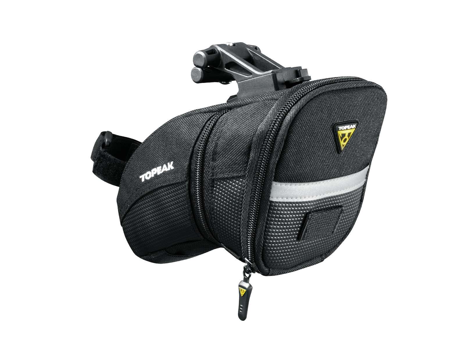 De Topeak Aero Wedge Pack Large zadeltas heeft een vorm die op natuurlijke wijze aan sluit bij de vorm van je zadel. Dit maakt hem zeer aerodynamisch. Hij is speciaal ontworpen voor sportieve zadels. Hij is zeer eenvoudig te bevestigen aan je zadel aan de hand van een quick click systeem. Met 1.97L aan inhoud neem je alle accessoires die je onderweg nodig hebt makkelijk mee. De zadeltas