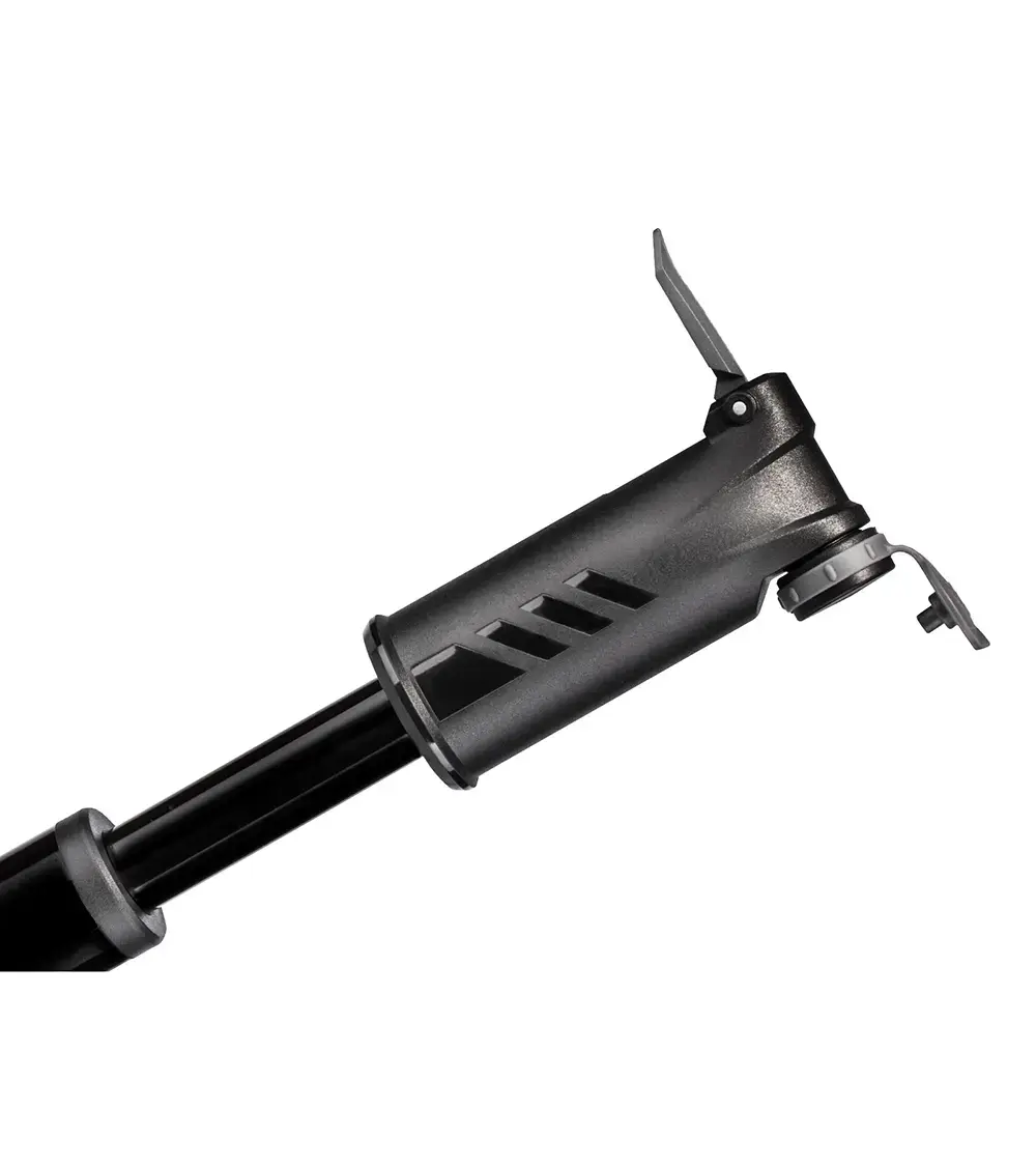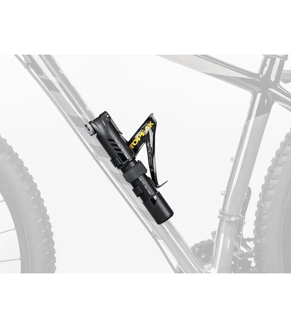 De MountainTT minipomp van Topeak is speciaal voor de mountainbike en pompt banden razendsnel op tot 8 bar. Deze pomp brengt de lucht van een grote kamer naar een kleinere kamer, waardoor je meer lucht onder een hogere druk pompt. Hierdoor pomp je je banden 50% sneller op. Met de aluminium duimhendel lock je de pomp op het Presta, Dunlop of Schrader-ventiel. De pomp wordt geleverd inclusief mount voor de bidonhouder-nokjes.