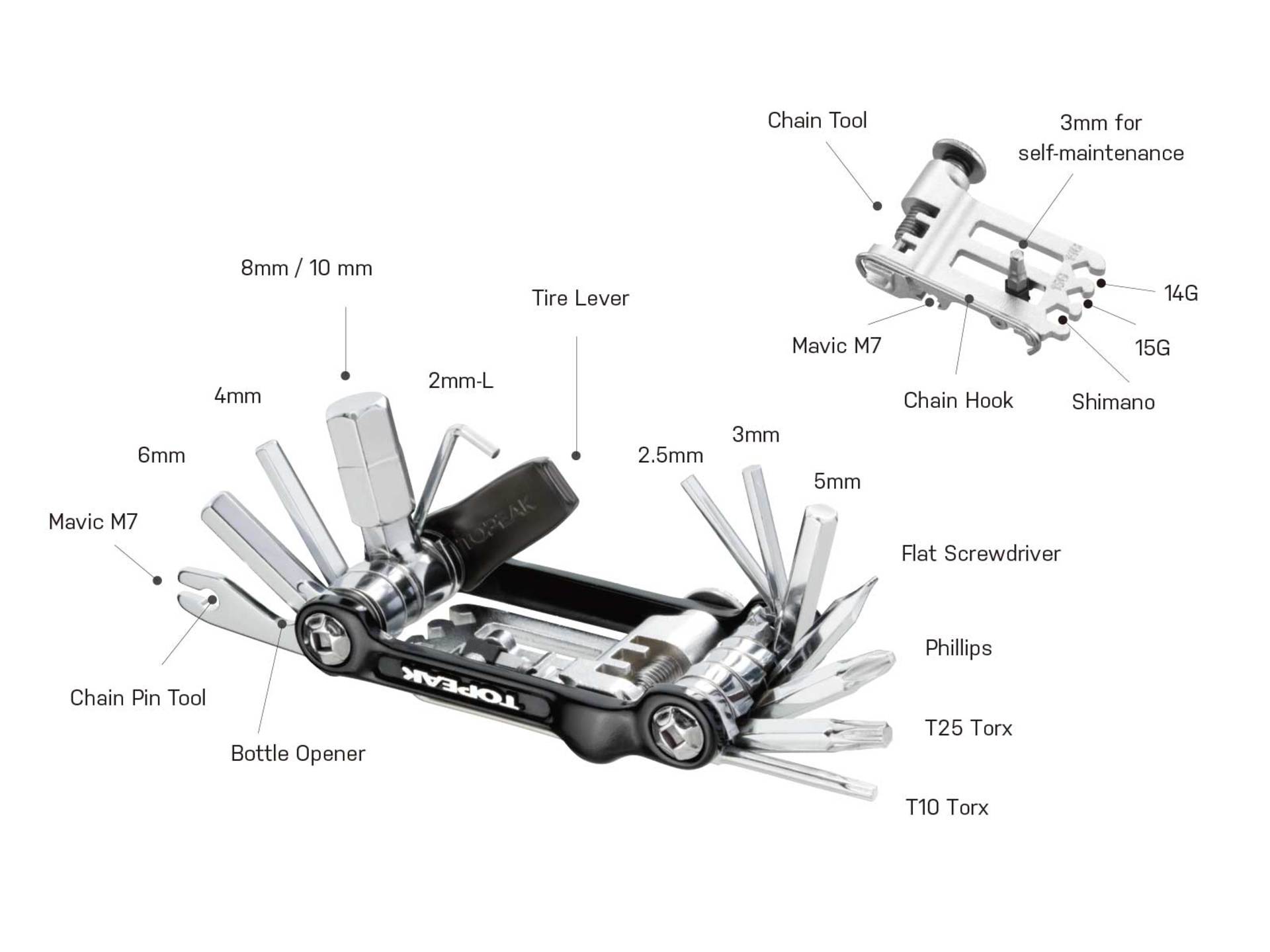 De Ninja Master+ Toolbox T20 van Topeak is te monteren onder een Topeak Ninja bidonhouder met verwisselbare Cage mount. Daarnaast is deze gereedschapsset ook met de frame mount aan het frame, zadelpen of stuurpen te monteren met de meegeleverde framebevestiging en kabelbinders. De reparatieset bestaat uit 23 functies met onder meer kettingereedschap en spaaksleutels. Verder bevat de box een aantal inbussleutels, een Torx T25, 1 bandenlichter en een flesopener voor gedane arbeid.