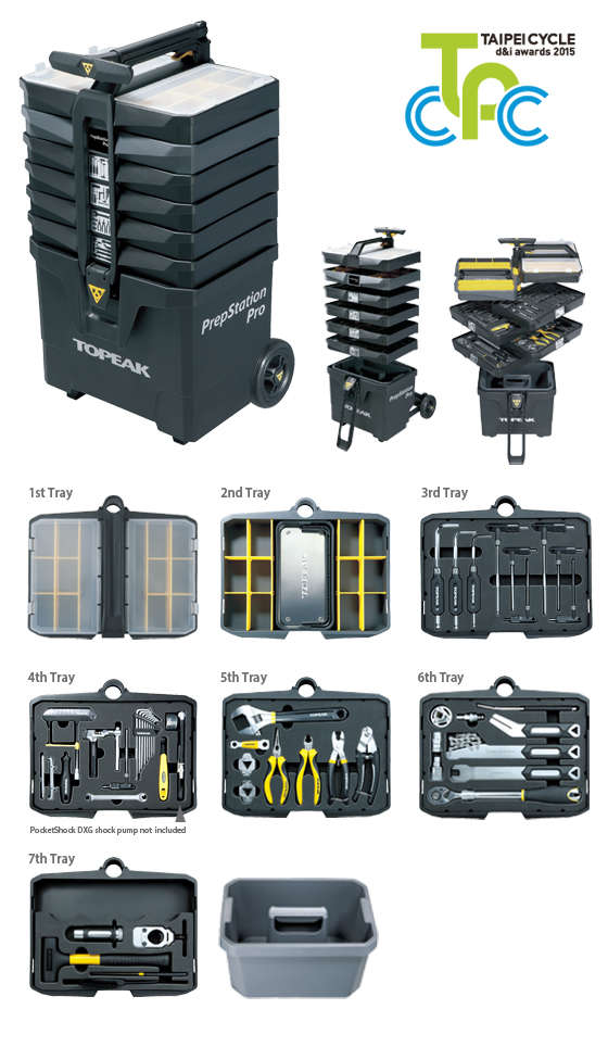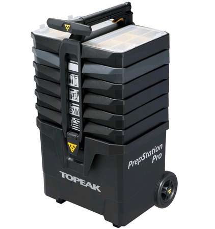Met deze Topeak Prepstation Pro is elke Fietsklus een eitje. De trolley is zeer compleet, prettig in gebruik en zeer degelijk gebouwd met het oog op duurzaamheid. De Prepstation Pro is opgebouwd uit 7 gereedschap vakken, 2 vakken voor klein materiaal, 4 vakken met groter fietsgereedschap en 1 groter vak voor bijvoorbeeld reinigingsmateriaal en onderhoudsmiddelen.