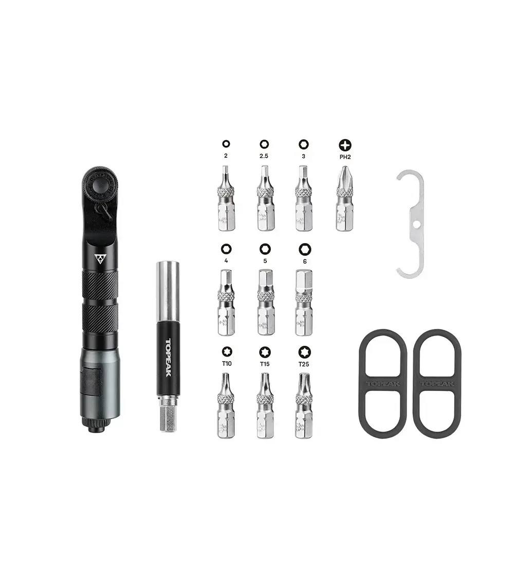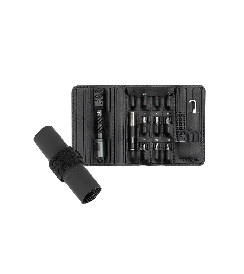 De Topeak minitool Ratchet'n Roll Tool EX bestaat uit 14 delen. Je hebt alles bij de hand om de meest voorkomende klussen van de fiets zelf eenvoudig uit te voeren. Past makkelijk in je achterzak of in de meeste zadeltassen. Naast gereedschap bevat de houder ook 2 siliconen straps om 1 co2 patroon en twee bandenlichters meer vast te maken.
