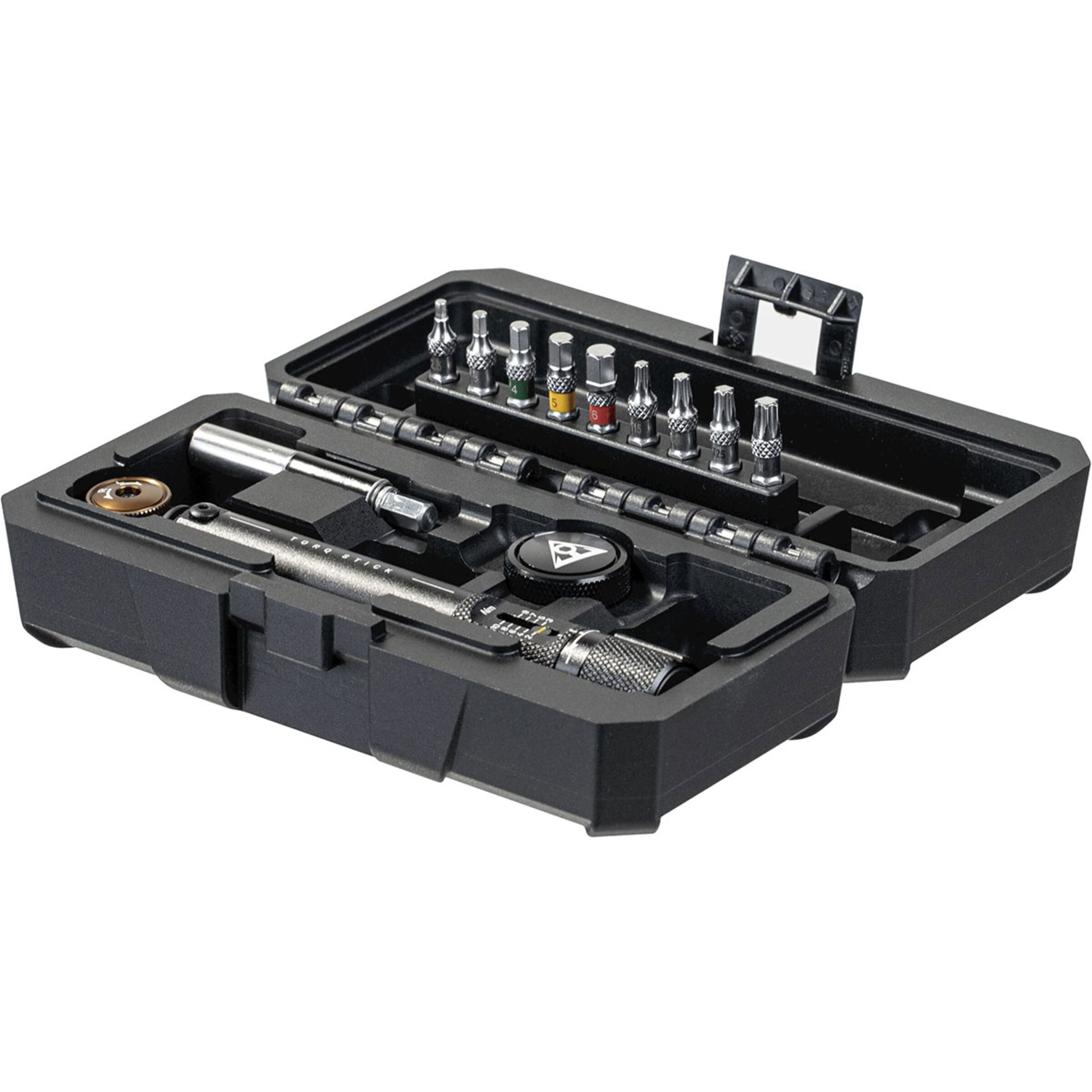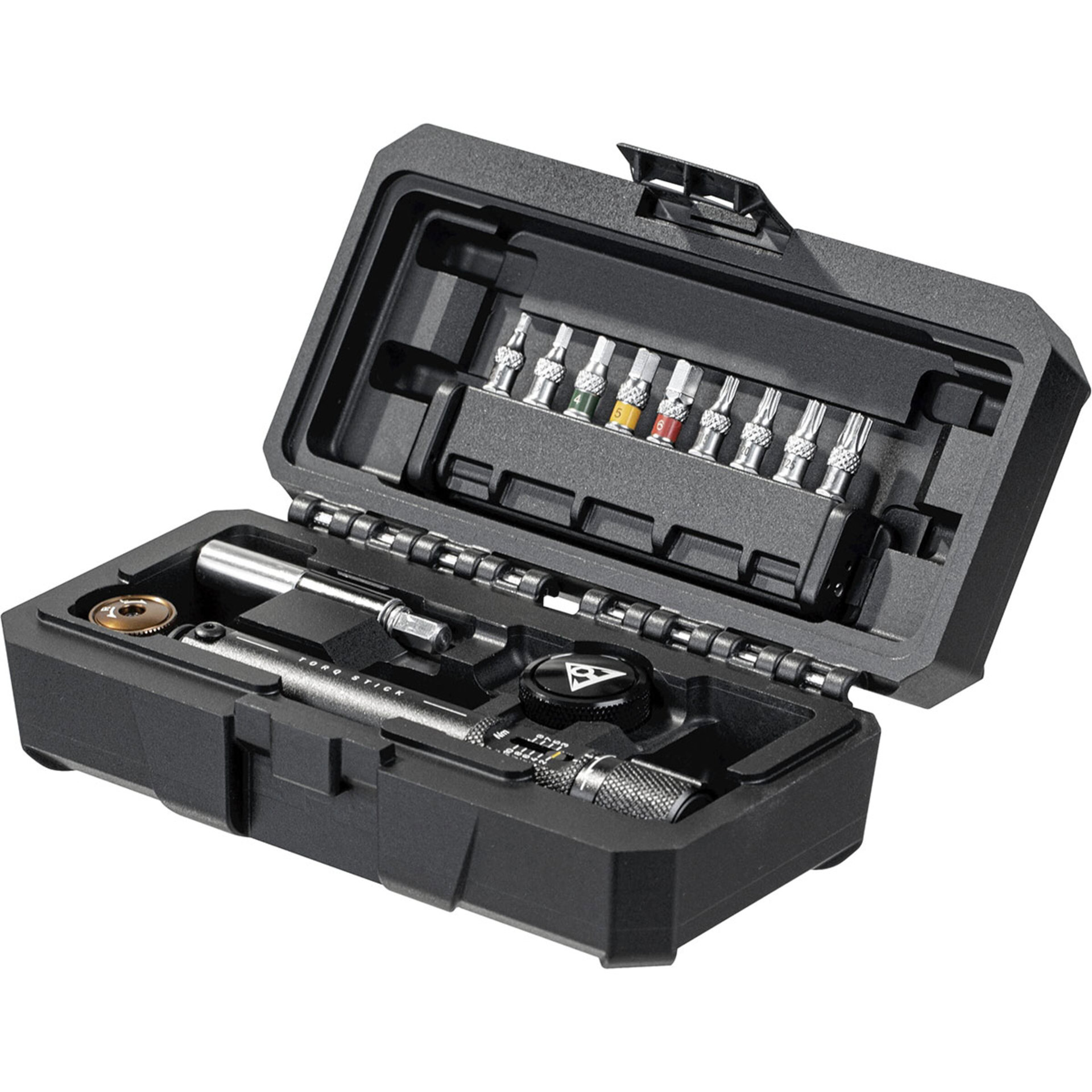 De Torq Stick Pro 2-10Nm Momentsleutel van Topeak komt in een complete werkplaatskwaliteit pakket met uitgebreid assortiment gereedschap voor allerlei klussen. De Torq Stick bevat een standaard omkeerbare zeskantige ratelkop die instelbaar is met vooraf ingesteld bereik van 2 tot 10 Nm. Dit handige stuk gereedschap bevat bitjes van 30mm. lengte, waarmee je moeilijke boutlocaties ook kunt bereiken. Wanneer je de momentsleutel hebt ingesteld hoor je een klik wanneer het vooraf ingestelde koppel is bereikt.