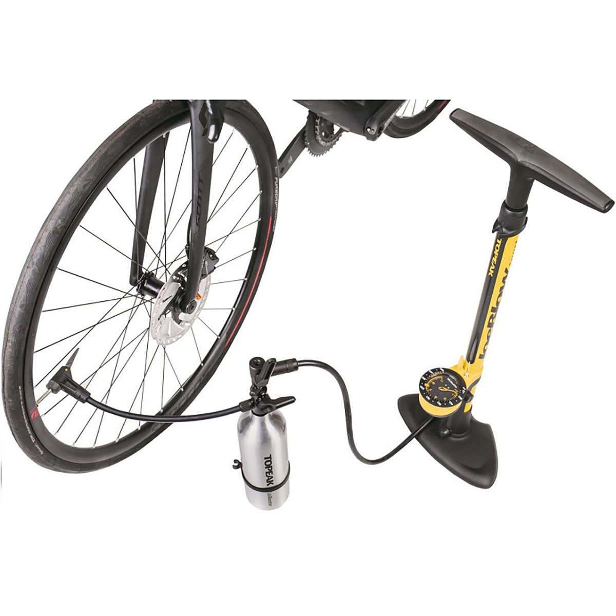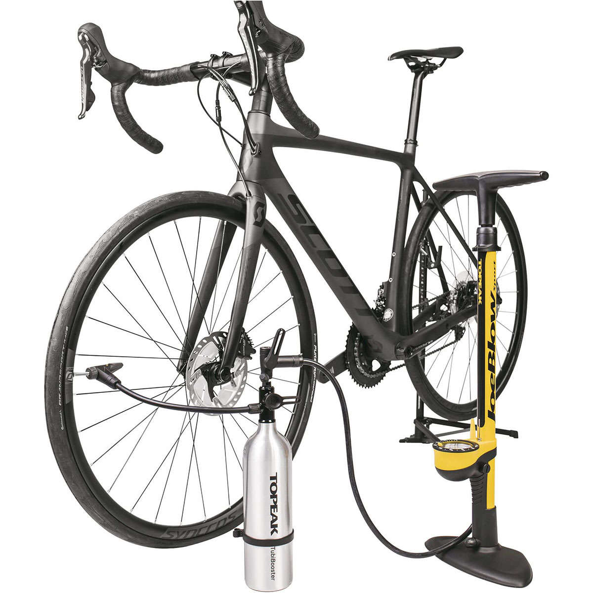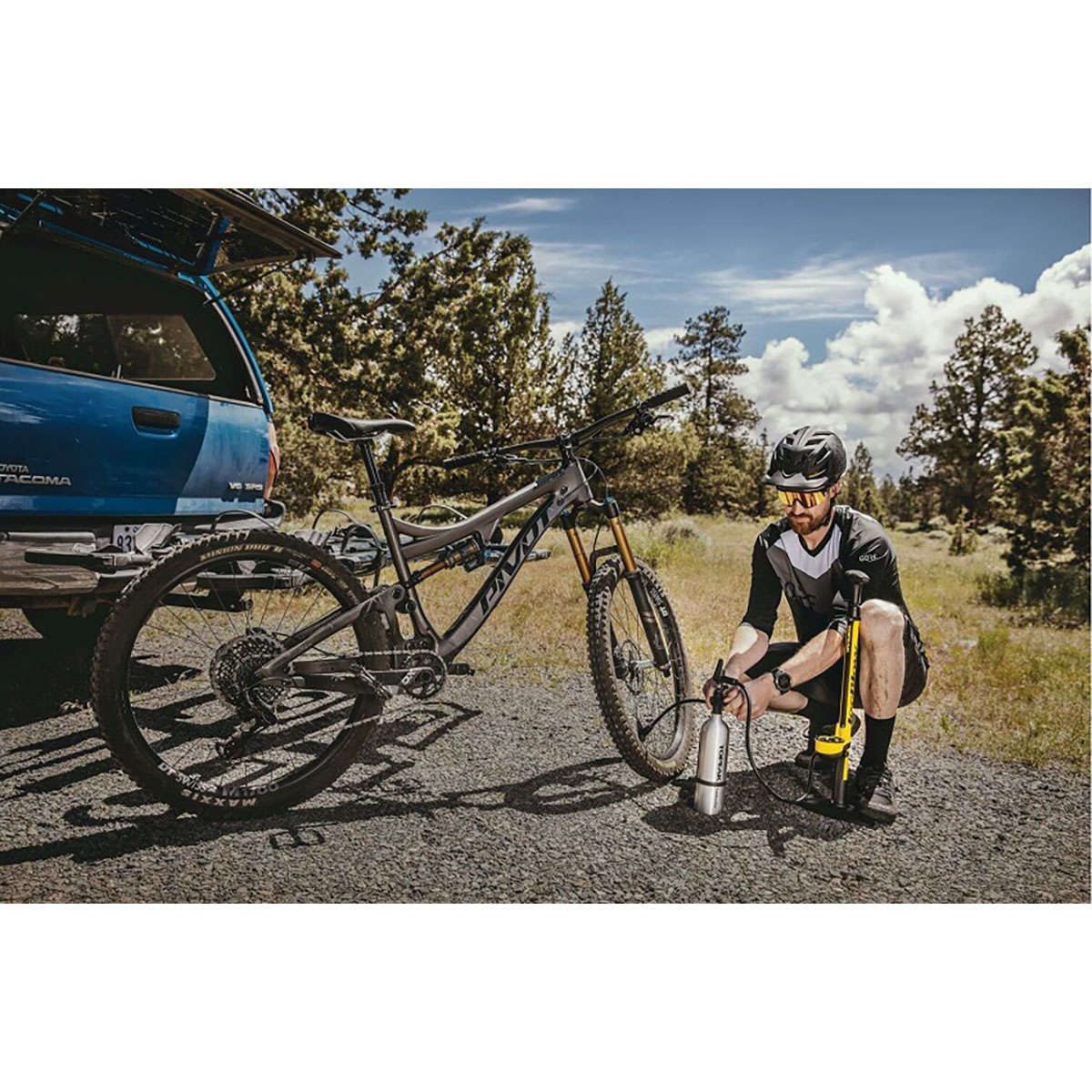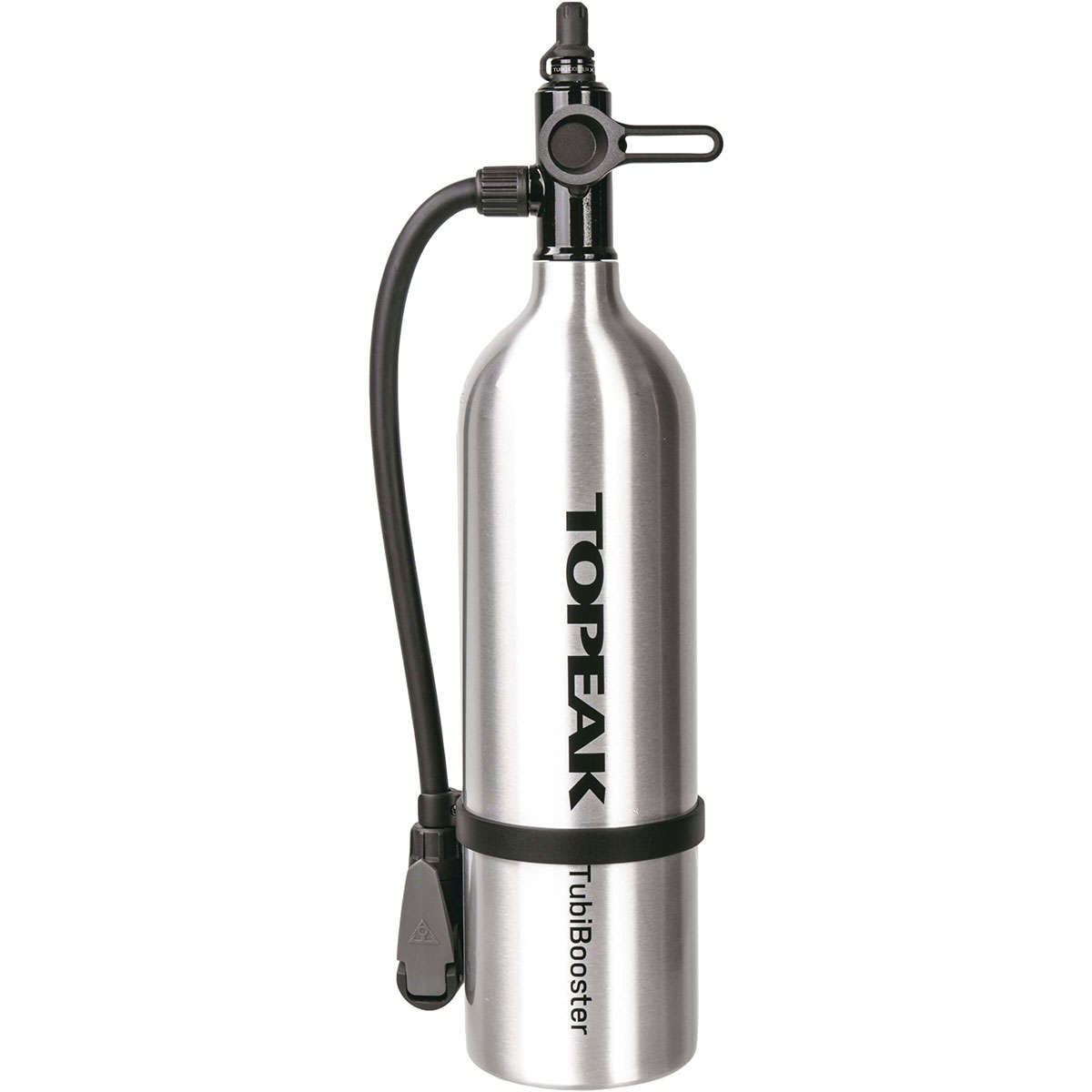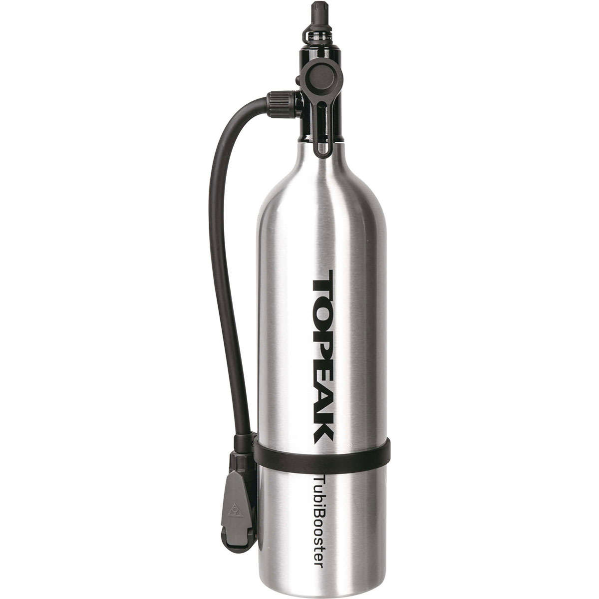 De Topeak TubiBooster X is een aluminium luchttank die je met met een vloerpomp tot 14 bar (200 psi) kunt vullen, zoals een compressor dat ook zou doen. Daarna zet je hem op het ventiel zetten en een tubelessband in een keer vullen met lucht. Daardoor 'zet' deze zich op de velg en kun je de band gaan gebruiken. Vul de luchttank in de 'CHARGE'-stand en draai vervolgens de hendel naar de 'INFLATE'-stand voor snel oppompen tot een perfecte bandendruk of om de band in de velgrand te drukken. De geïntegreerde flexibele slang heeft een pompkop die past op Presta- en Schrader-ventielen.