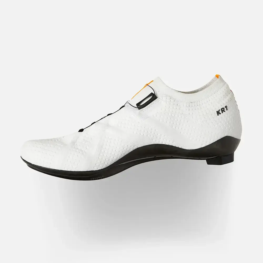 Deze DMT KR1 wielrenschoen is één van de topschoenen uit het assortiment van DMT. Deze hoogwaardige raceschoen doet eigenlijk geen concessies aan pasvorm of comfort. Het uit één stuk vervaardigde en naadloze gebreide bovenwerk zorgt voor een uitstekende ventilatie bij zware inspanning. De schoen heeft een BOA® Fit-systeem met een enkele IP1-draaiknop, zodat de schoen perfect om jouw voet heen past. De zool is gemaakt van een extreem lichtgewicht en stijf carbon. Dit maakt de schoenen uiteraard zeer licht, maar maakt ook de krachtoverbrenging naar de pedalen extreem goed. Voor een perfecte pasvorm en ongekende prestaties zijn deze schoenen ontwikkeld in samenwerking met Elia Viviani.
