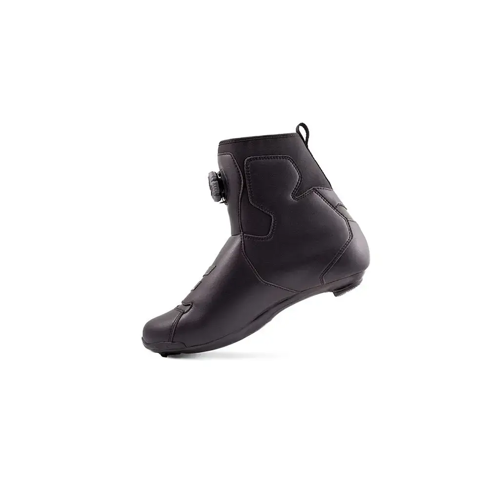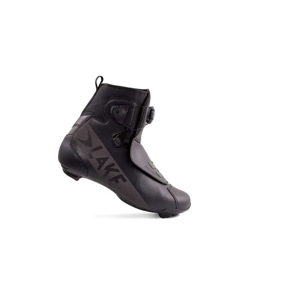 De Lake CX146-X is een uitstekende wielrenchoen voor koude en/of natte omstandigheden. De schoen is ontworpen voor het voorjaar, de herfst of milde winters. De schoen is gemaakt voor brede voetbreedtes. Het hoge ontwerp maakt dat je voet en enkel extra beschermd zijn tegen de elementen. De Thinsulate™ 200gr isolatie zorgt er, samen met een waterdicht membraan, voor dat je voeten warm en droog blijven van binnenuit. De buitenkant van de schoen is gemaakt van Clarino™ microvezel wat niet alleen waterdicht en slijtvast is, maar ook een stuk soepeler en lichter dan leer. De met glasvezel versterkte nylon zool zorgt voor een gemiddelde stijfheid tijdens het fietsen. De zool is daarbij voorzien van een geavanceerde rubbercompound die te allen tijde grip biedt in natte omstandigheden. De zool is gewaardeerd als 60/40 zool wat maakt dat er ook goed op te lopen is als je even niet op het zadel zit. De M4 BOA sluiting is extra robuust uitgevoerd en kan eenvoudig bediend worden. Ook in natte omstandigheden of met handschoenen aan. Het Click-Fit Quick Release systeem zorgt dat je de schoen eenvoudig aan en uit kunt trekken. De extra flap over de wreef en het reflecterende logo op de zijkant maken deze schoen helemaal af. Al met al een erg veelzijdige topschoen voor de meest extreme raceavonturen!
