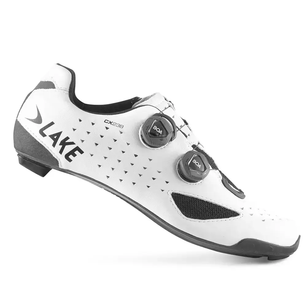 Deze Lake CX238 Raceschoenen zijn lichtgewicht racefietsschoenen voor de fanatieke wielrenner die in de zomer een druk fietsprogramma heeft. De schoen biedt een uitstekende krachtoverbrenging dankzij de zeer stijve full carbon zool. Deze is ook zeer licht, waardoor de weegschaal al stopt bij 289 gram. Door de stijve zool is deze schoen zeer geschikt voor parcours waar je een hoge cadans moet draaien. Hierbij komt wel een constante druk op je voeten te staan, waardoor deze zullen uitzetten. Daarvoor is er iets meer ruimte gemaakt rond de bal van de voet waardoor deze de ruimte hebben om uit te zetten. Zeker op warme dagen waar je voeten nog meer zullen uitzetten is dat zeker geen overbodige luxe. Het bovenwerk is gemaakt van leer met perforaties en mesh inzetstukken, waardoor je voeten hun warmte goed kwijt kunnen. De dubbele BOA sluiting helpt om de perfecte pasvorm te vinden. Ook zijn er verstevigingen aan gebracht op de hiel en de tenen, waardoor het leer beschermt wordt op deze kwetsbare plekken. Deze wide versie is 15mm breder bij de bal van de voet dan het standaard model.