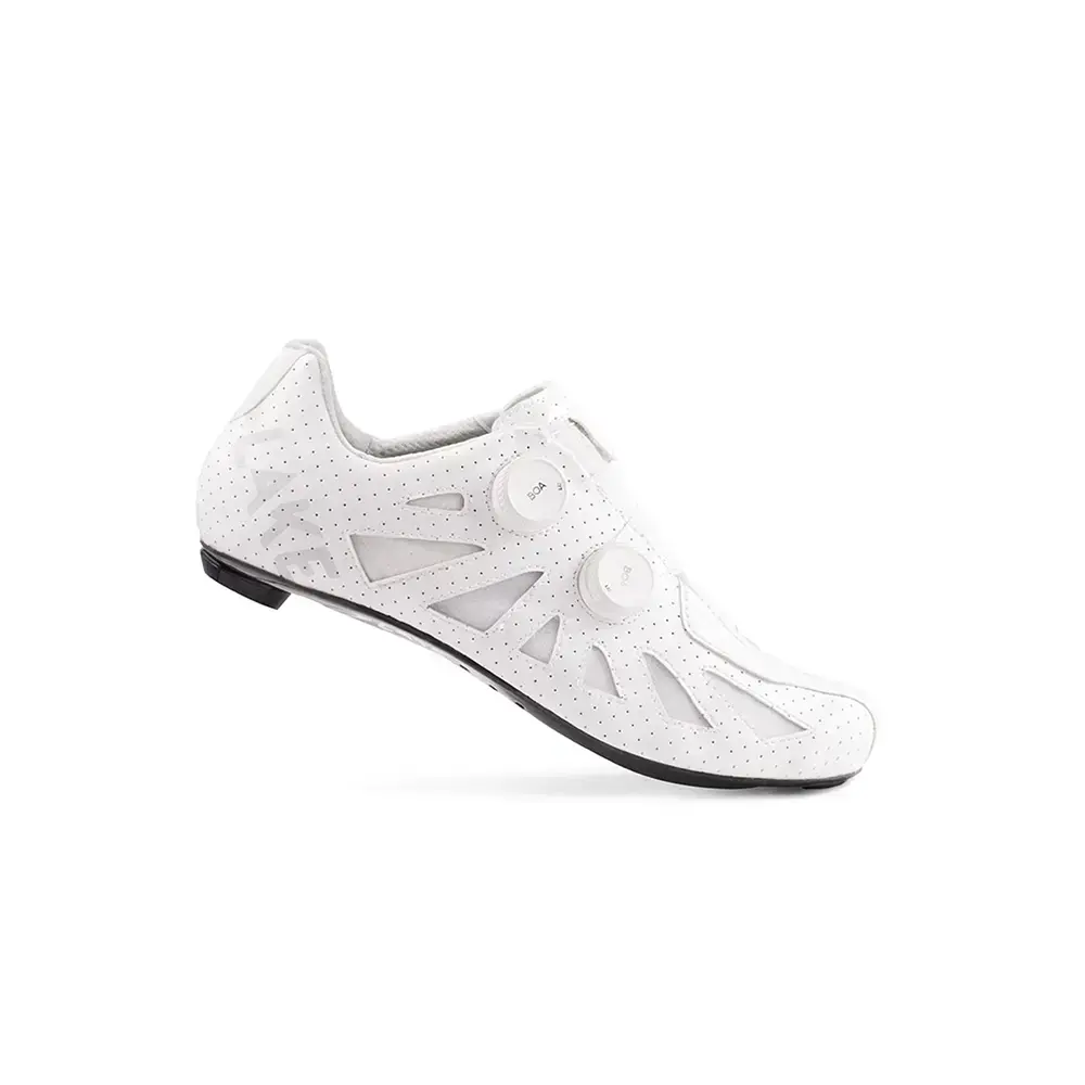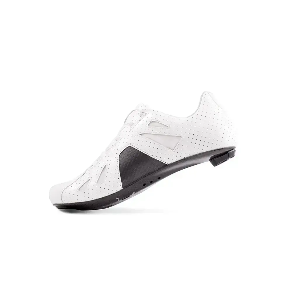 De Lake CX302 Wide wielrenschoenen zijn extreem licht van gewicht en daardoor ideaal voor gebruik in de bergen. Ondanks het lage gewicht biedt de schoen veel comfort, een nauwsluitende pasvorm en uitstekende krachtoverbrenging. De bovenzijde is gemaakt van de Clarino-microvezel die zorgt voor die goede pasvorm. Het afstellen van de schoen gaat eenvoudig met de dubbele BOA® Li2-sluiting. De zool is een handgemaakte CFC zool van 3K carbon, waardoor er zeker geen kracht verloren gaat in je pedaalslag. De gepatenteerde zool bestaat uit twee lagen. De buitenste laag is het stijve carbon, maar de binnenzijde geeft enige flexibiliteit. Deze biedt ruimte rondom de bal van de voet waar de voet de neiging heeft op te zwellen en warm te worden. Dat kan voor gevoelloosheid zorgen, maar wordt voorkomen met deze zool. De schoenen wegen slechts 195 gram in maat 44, extreem licht van gewicht dus.