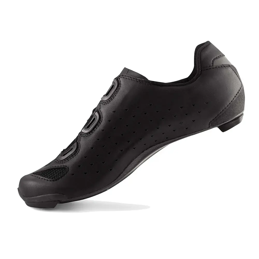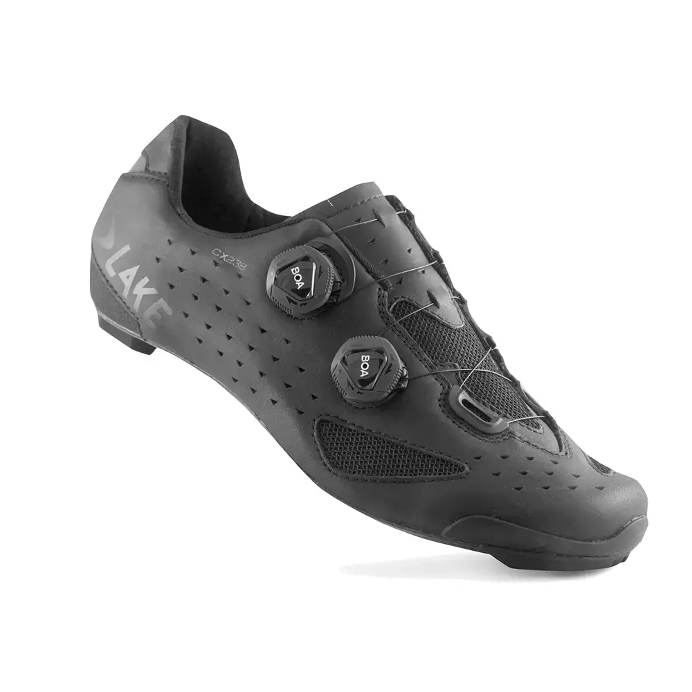 Deze Lake CX238 wielrenschoenen zijn zeer hoogwaardige schoenen voor zeer gedreven wielrenners. Deze schoen is bedoeld voor fietsers met een smalle tot gemiddelde voetbreedte. Door de zeer stijve carbon zool wordt al je kracht direct op de pedalen gebracht. Het slanke ontwerp sluit nauw om je voeten aan om beweging in de schoen tot een minimum te beperken, maar biedt wel voldoende ruimte om afknelling te voorkomen tijdens stukken waar je even moet rennen in een wedstrijd. Als aanvulling beschikken de schoenen over twee BOA sluitingen welke zeer precies af te stellen zijn. Hierdoor zal je altijd de perfecte pasvorm vinden. Om te zorgen dat je geen té warme voeten krijgt, zijn er perforaties in het bovenwerk aangebracht en extra mesh stukken toegevoegd. Daarnaast helpt de voering met het snel afvoeren van hitte en vocht. Het bovenwerk is gemaakt van slijtvast en waterafstotend leder met extra Aramide stukken op de meest blootgestelde delen zoals de hiel. De rubberen onderzool biedt veel grip in modderige omstandigheden, ideaal tijdens een wedstrijd waarbij je ook af en toe van de fiets af moet.