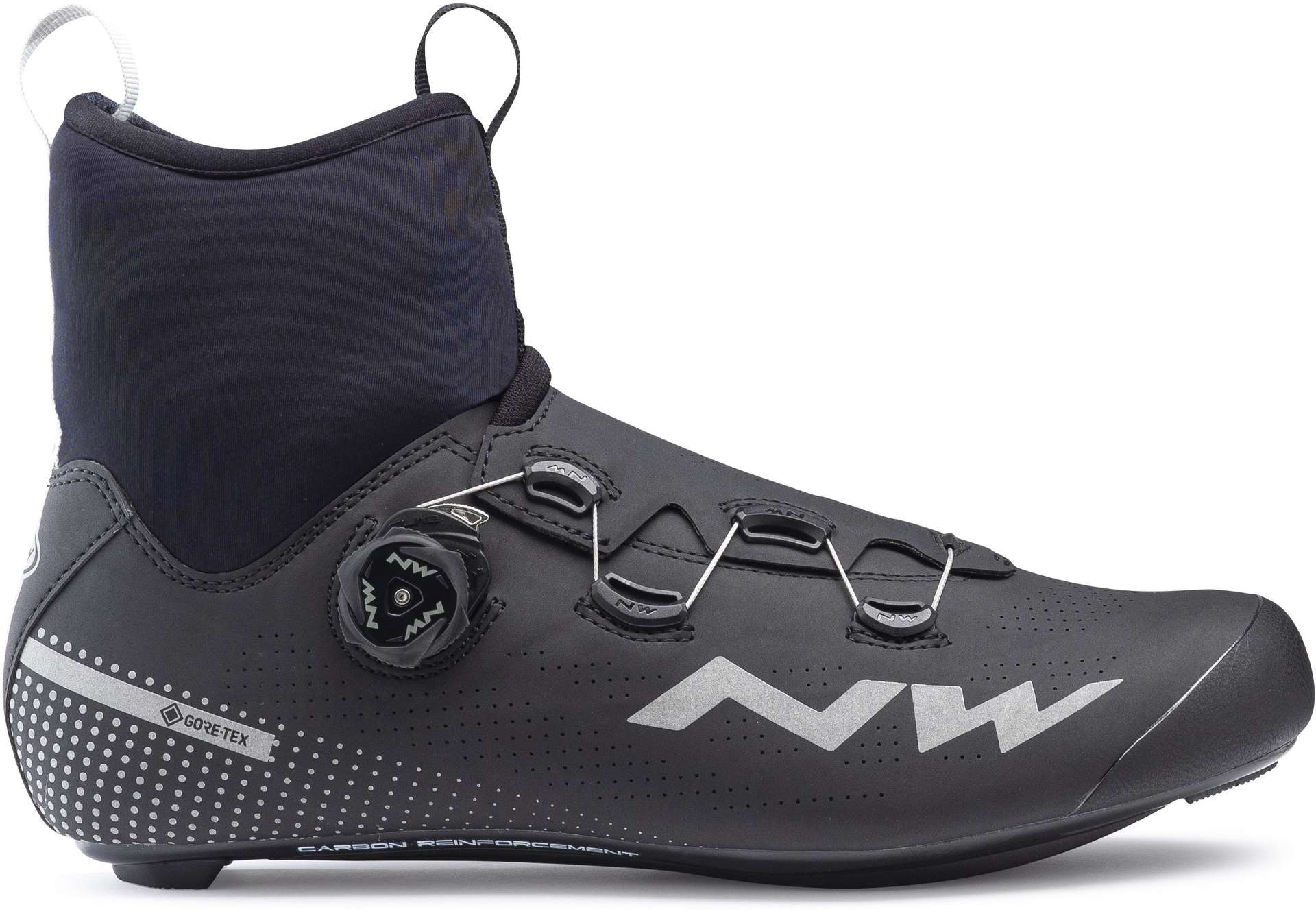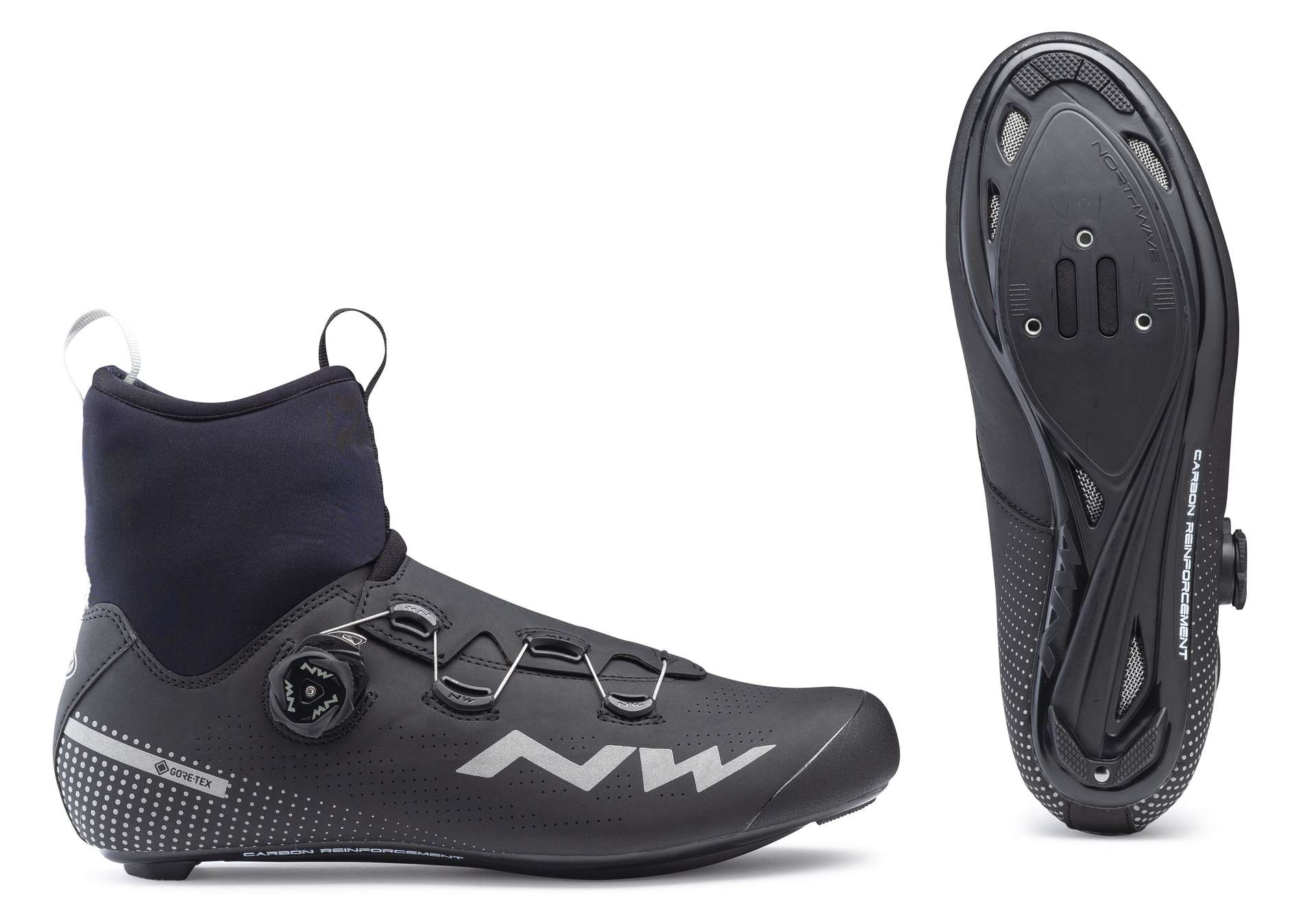 De Northwave Celsius R GTX Wielrenschoenen zijn ideaal om mee te fietsen in milde winterse omstandigheden. Deze schoenen zijn extra hoog waardoor ze tot de enkel komen en sluiten ook erg mooi aan. Het GORE-TEX membraan zorgt ervoor dat de schoen waterdicht is, winddicht is en ook nog eens een erg goed ademend vermogen heeft. De zool is versterkt met carbon en heeft een stijfheidsindex van 8.0 waardoor je al je kracht goed op de pedalen kan overbrengen. Het SLW2 dial vetersysteem is zeer precies af te stellen tot de perfecte pasvorm en met één beweging los te maken. Of juist beetje bij beetje te openen, om zo de perfecte pasvorm te vinden. Het verhoogde stuk rondom de enkels is gemaakt van isolerend en elastisch neopreen, welke dankzij de GORE-TEX technologie ook water en wind tegen houdt. In combinatie met het vier lagen dikke Arctic GTX voetbed en de isolerende voorvoet zorgt dit voor gegarandeerd warme voeten. Verder hebben de schoenen rondom reflecterende details en een verstevigde neus voor 360 graden zichtbaarheid en meer duurzaamheid.
