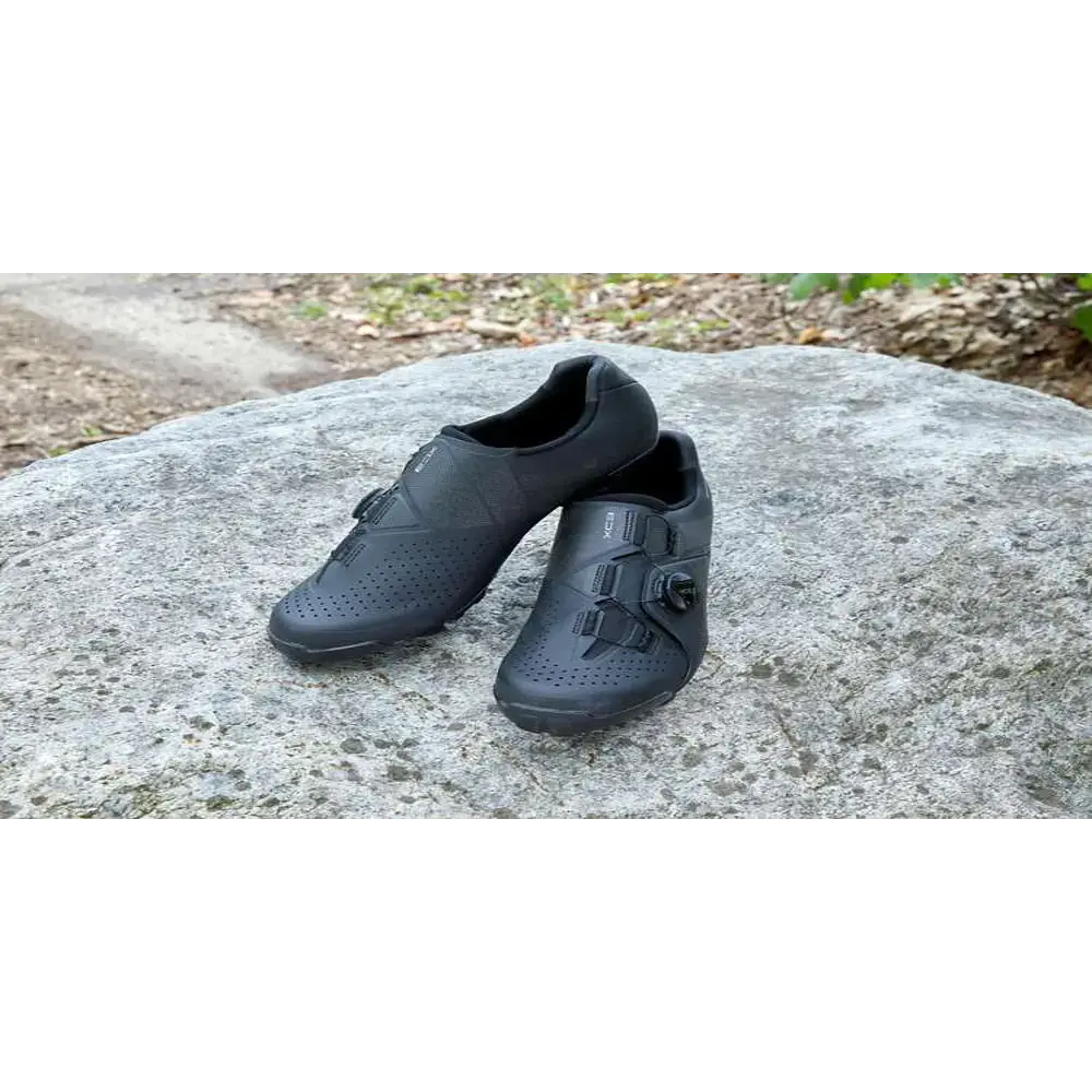 De bredere variant van de Shimano XC300 Mountainbikeschoenen zorgen voor een nieuw niveau van pasvorm, stabiliteit en lichtgewicht prestaties. De rubberen XC zool met racepatroon zorgt voor goede grip op je pedalen, maar ook naast je fiets. Dankzij het bovenwerk van geperforeerd synthetisch leer ervaar je een goede pasvorm en ademend vermogen. De lichtgewicht glasvezelversterkte nylon tussenzool zorgt voor goede krachtoverbrenging op je pedalen. De speciale tussenzool helpt de voet te stabiliseren en zorgt voor een super goede krachtoverdracht en efficiëntie.