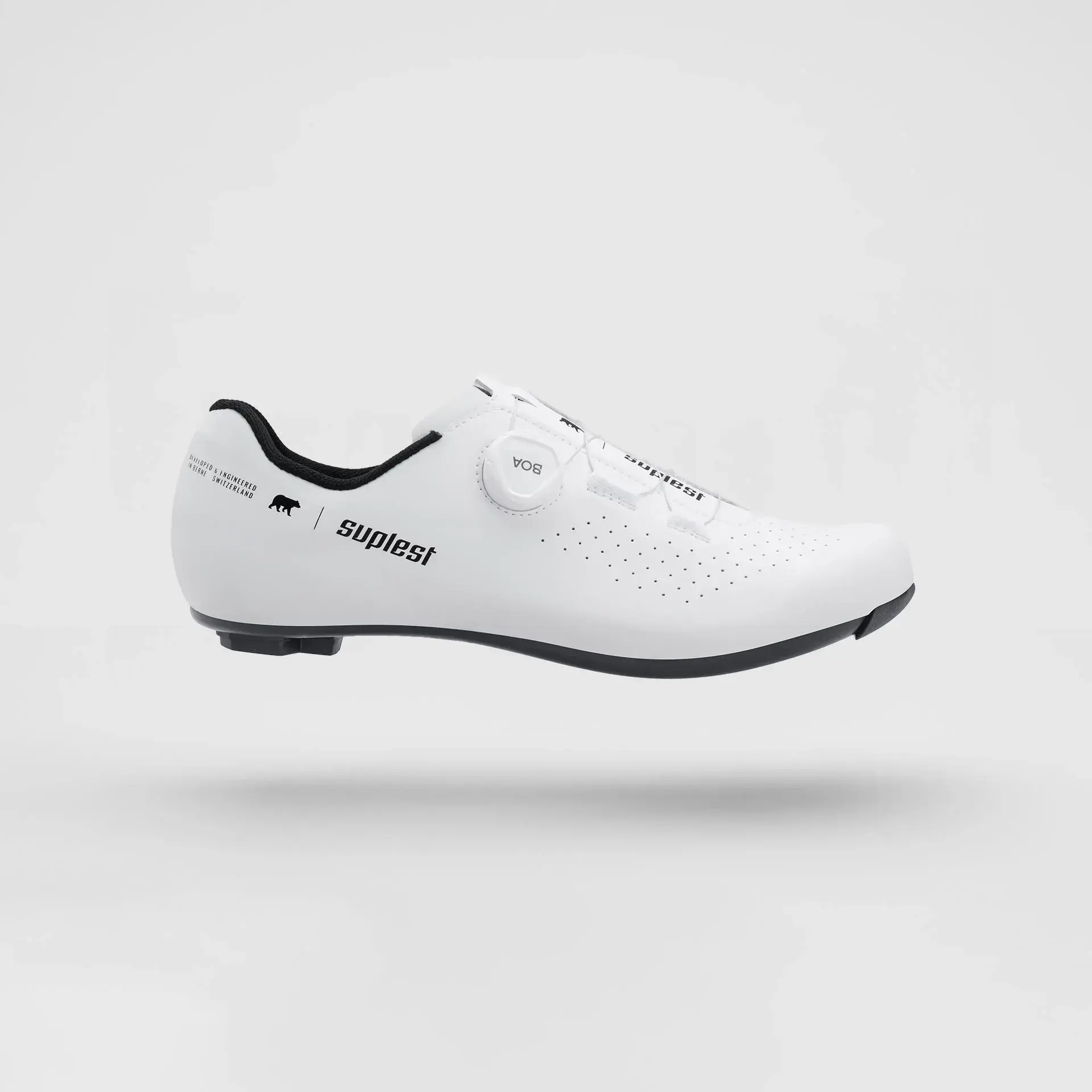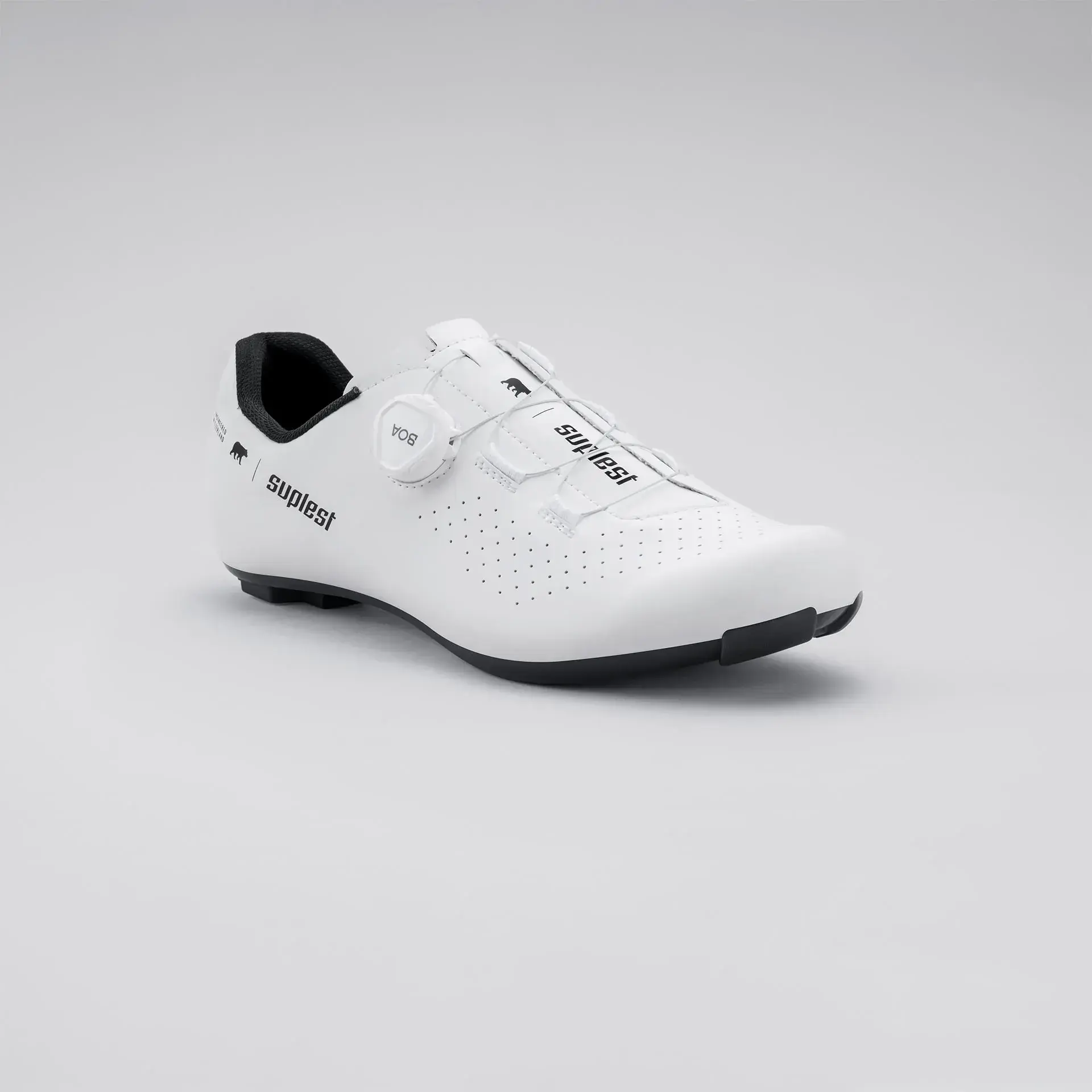 De Suplest Road Pro Wielrenschoenen zijn ontworpen voor prestaties op het hoogste niveau. Het bovenwerk bestaat uit een innovatieve 'sandwichconstructie', waarbij een 3-mesh materiaal aan beide zijden is gecoat met een dunne TPU-laag. Dit verhoogt het comfort en zorgt voor een optimale pasvorm. De Flex ZONE bij de voorvoet zorgt voor een soepele krachtoverbrenging tijdens het trappen. De schoenen zijn uitgerust met BOA-sluitingen en een 3D-hielkap, zodat je voet altijd stevig op zijn plaats blijft. De gemiddeld stijve ERGO carbonzool in combinatie met de Solestar binnenzool maximaliseert de efficiëntie en stabiliteit tijdens lange ritten. Deze schoen is ideaal voor wielrenners die het uiterste uit hun prestaties willen halen.