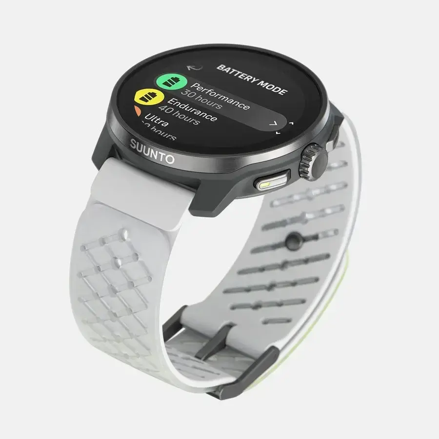 Supersterke batterijDe batterij van de Race S is voorzien van een aantal handige standen. Wanneer het horloge alleen gebruikt wordt voor de tijd, gaat het horloge 13 dagen mee. Zodra het horloge overschakelt op de trainingsmodus, gelden er verschillende tijden van accuduur. Zo gaat het horloge 30 uur mee op Performance, 40 uur mee met Endurance en 120 uur in Tour mode.