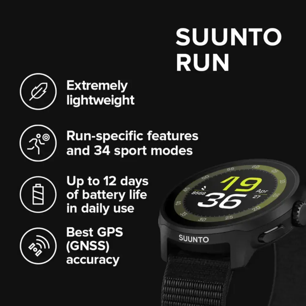 Het Suunto Run GPS Sporthorloge is speciaal ontwikkeld voor hardlopers die prestaties willen verbeteren met nauwkeurige data en betrouwbare tracking. Met zijn extreem lage gewicht van slechts 36 gram merk je nauwelijks dat je het horloge draagt, terwijl het toch alles registreert: van hartslag, training load, slaapkwaliteit en herstel, tot nauwkeurige GPS-routebegeleiding dankzij dual-band GNSS. Met een helder AMOLED-display en intuïtieve kroonbediening navigeer je snel door alle functies, zelfs tijdens het sporten. Suunto Run biedt meer dan 34 sportmodi, geavanceerde trainings- en herstelinzichten én de mogelijkheid om je muziek vanaf het horloge te bedienen of offline te beluisteren. Dit horloge is je ideale partner — van een ontspannen jog tot een ultramarathon.