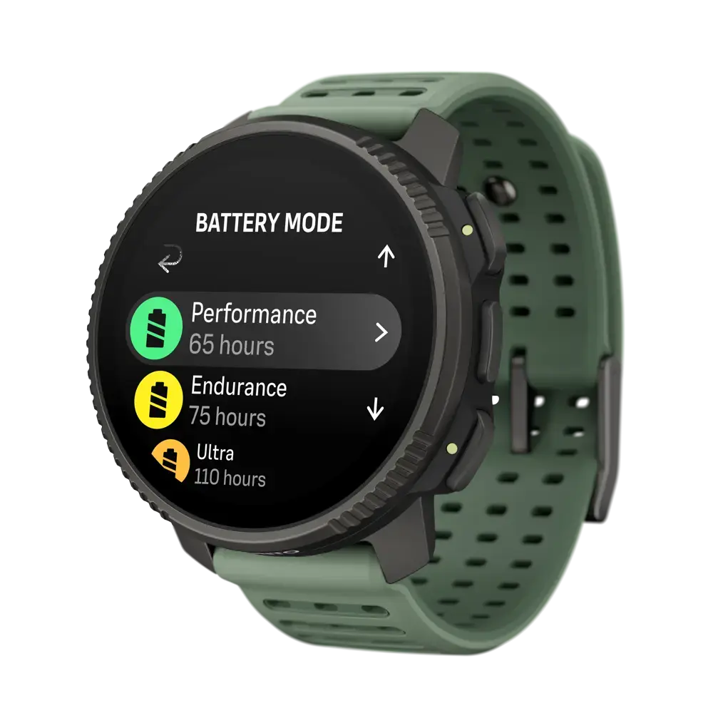 Supersterke batterijDe batterij van de Suunto Vertical 2 is misschien wel de beste op de markt op dit moment. De batterij is namelijk voorzien van een aantal handige standen. Wanneer het horloge alleen gebruikt wordt voor de tijd, gaat het horloge tot 20 dagen mee zonder tussendoor laden. Zodra het horloge overschakelt op de trainingsmodus, gelden er verschillende tijden van duur. Zo gaat het horloge 65 uur mee in de beste GPS-modus.