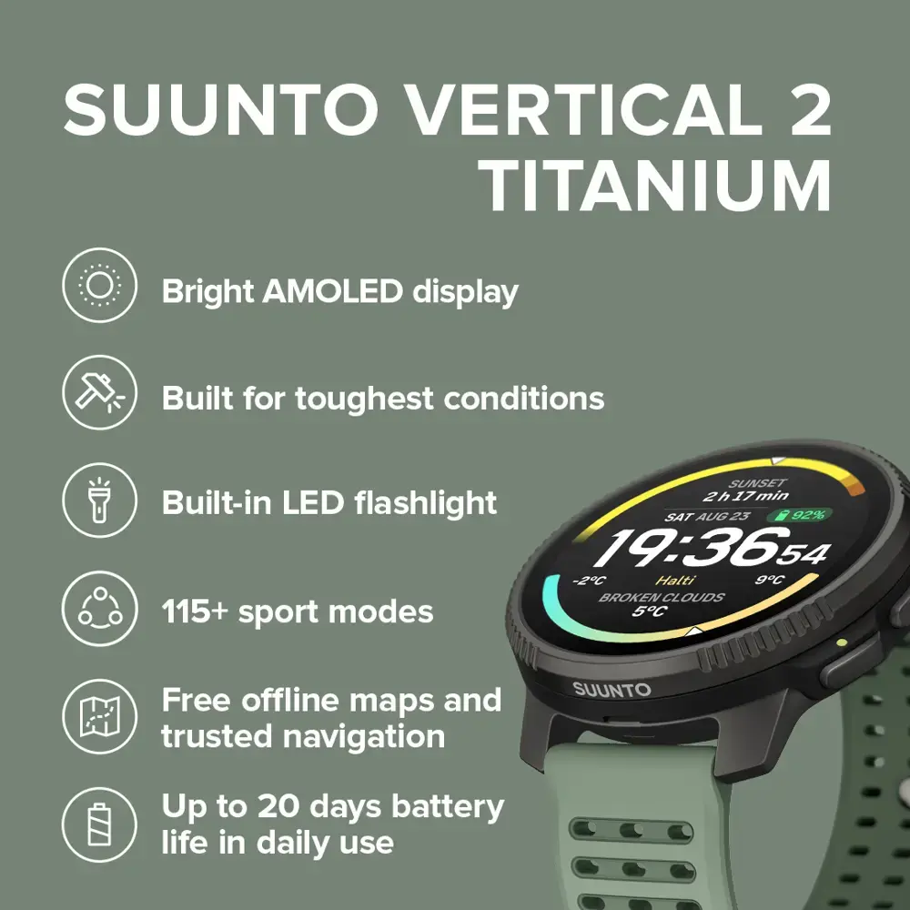 Dit pakket bevatWat is nieuw in de Suunto Vertical 2? - Helder AMOLED-scherm: Voor betere zichtbaarheid en kleurweergave.