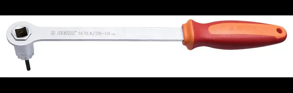 De Unior Cassette Afnemer met Handvat is een praktisch en efficiënt gereedschap voor het verwijderen van cassettes van Shimano®, SRAM®, SunRace®, Suntour® en andere merken. Dit gereedschap werkt zoals de Unior 1670.7 sleutel, maar heeft een vast handvat, waardoor geen extra gereedschap nodig is om de sleutel vast te houden. Dit maakt het verwijderen van cassettes sneller en eenvoudiger. Het ergonomische dubbel-componenten handvat ligt comfortabel in de hand en biedt maximale grip en controle tijdens gebruik. Dankzij het doordachte ontwerp en de hoogwaardige materialen heeft deze cassette afnemer een lange levensduur en is hij bestand tegen intensief gebruik. Dit gereedschap is ideaal voor zowel professionele monteurs als doe-het-zelvers die hun cassette snel en zonder gedoe willen verwijderen.
