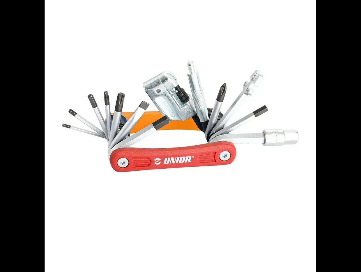 De Unior Euro 17 Multitool is een onmisbaar stuk gereedschap voor elke fietser die voorbereid de weg op wil. Ontworpen en geproduceerd in Slovenië, voldoet deze multitool aan de hoogste kwaliteitsnormen dankzij het gebruik van premium materialen zoals chroom-vanadium 4, molybdeen-vanadium 52 en chroom-silicium-vanadium 5. Dit zorgt voor een hoge duurzaamheid en precisie bij elke reparatie. De gereedschapspindels zijn verchroomd en de uiteinden hebben een extra zwarte oxidecoating voor maximale slijtvastheid. Met in totaal 17 functies, waaronder inbussleutels, torx-sleutels, een kettingpons, schroevendraaiers en een ventieltool, is deze multitool perfect geschikt voor snelle reparaties onderweg. Het compacte en lichtgewicht ontwerp van 184 gram maakt het eenvoudig mee te nemen in je zadeltas of achterzak.