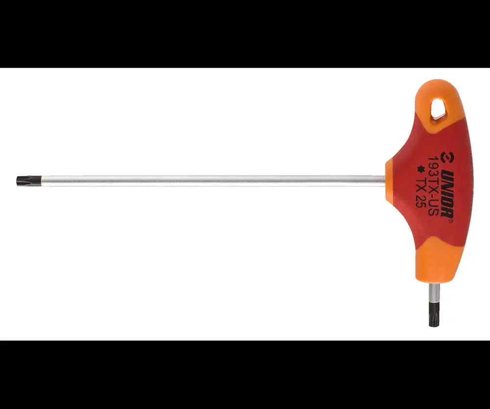 De Unior T-Greep Torx Sleutel is een krachtig en duurzaam gereedschap dat optimale grip en precisie biedt bij het werken met torx-schroeven. Vervaardigd uit hoogwaardig chroom-vanadiumstaal met verhoogde dichtheid op de drukpunten, garandeert deze sleutel een extreem lange levensduur en uitzonderlijke sterkte. De kling is verchroomd en de punt is zwart geanodiseerd, wat zorgt voor extra duurzaamheid en een betere pasvorm in de schroefkop.