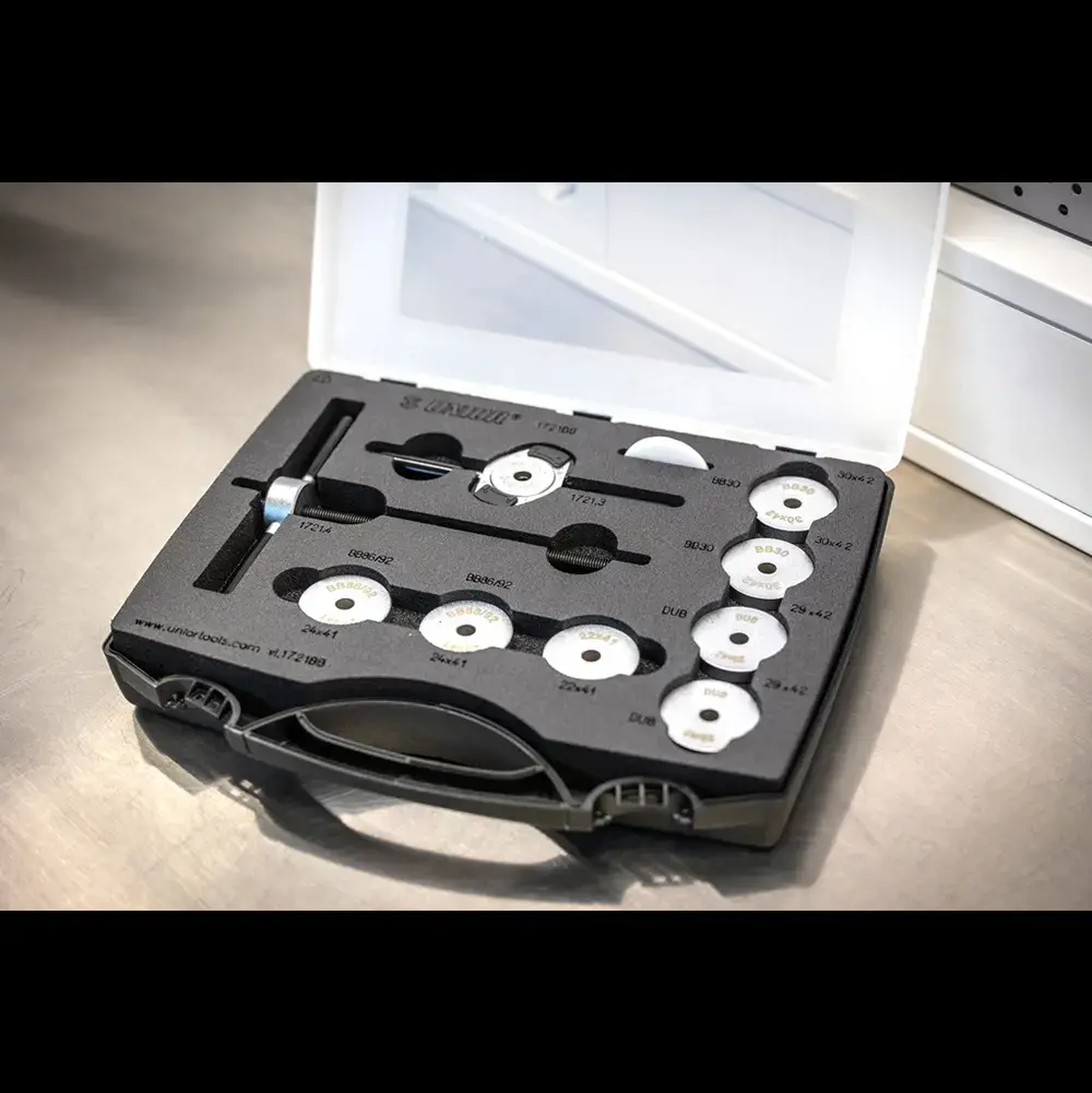 De Unior Trapas Lager Pers Kit is speciaal ontworpen voor de nauwkeurige installatie van Press-fit bottom brackets. Een correcte passing is essentieel voor een langdurige en kraakvrije werking van je trapaslagers. Deze set bevat drifts voor de meest gangbare Press-fit en BB30 trapasstandaarden, waaronder Sram DUB, BB30 en BB86/BB92. Het handvat met schroefdraad is voorzien van een snelsluiting, waardoor de installatie snel en eenvoudig verloopt. De complete set wordt geleverd in een stevige kunststof koffer met een laser-cut SOS foam tray voor georganiseerde opslag.