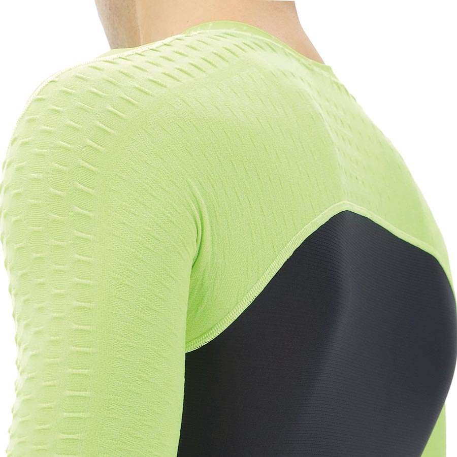 Het UYN Airwing Fietsshirt garandeert een zeer goede luchtstroom op de warmste dagen. De combinatie van het Hypermotion2-systeem en de Haloflex-technologie in de schouders wordt interactie tussen luchtstroom en jouw huid bevordert. Daarnaast is dit fietsshirt vederlicht, waardoor je soms niet eens merkt dat je het draagt. Op de rug bevindt zich een rugpaneel dat gemaakt is met micro-geperforeerde stoffen, om je ook hier een hoog ademend vermogen te bieden. Dit fietsshirt met aerodynamische pasvorm is perfect voor jouw ritten op hete dagen.