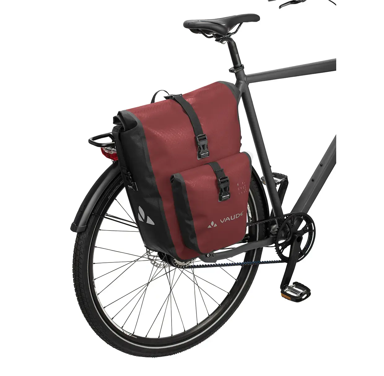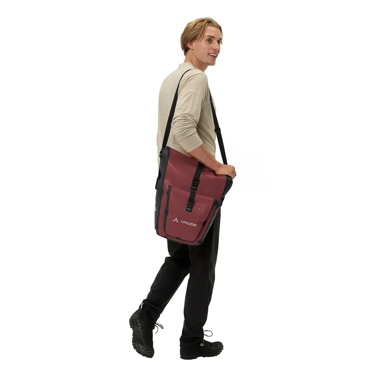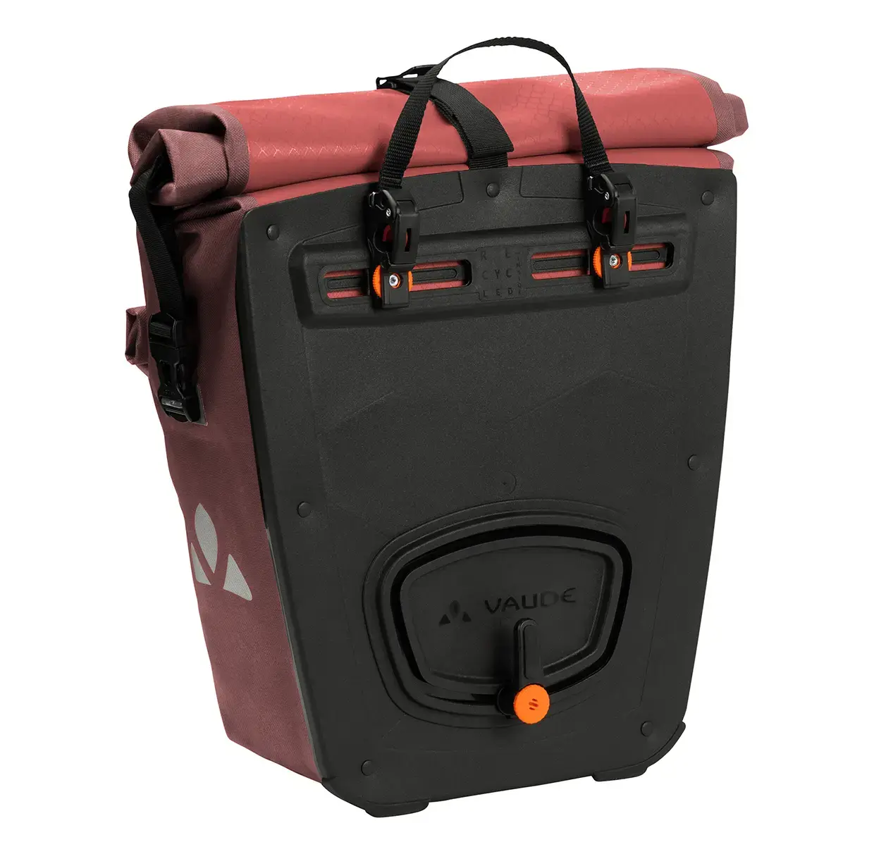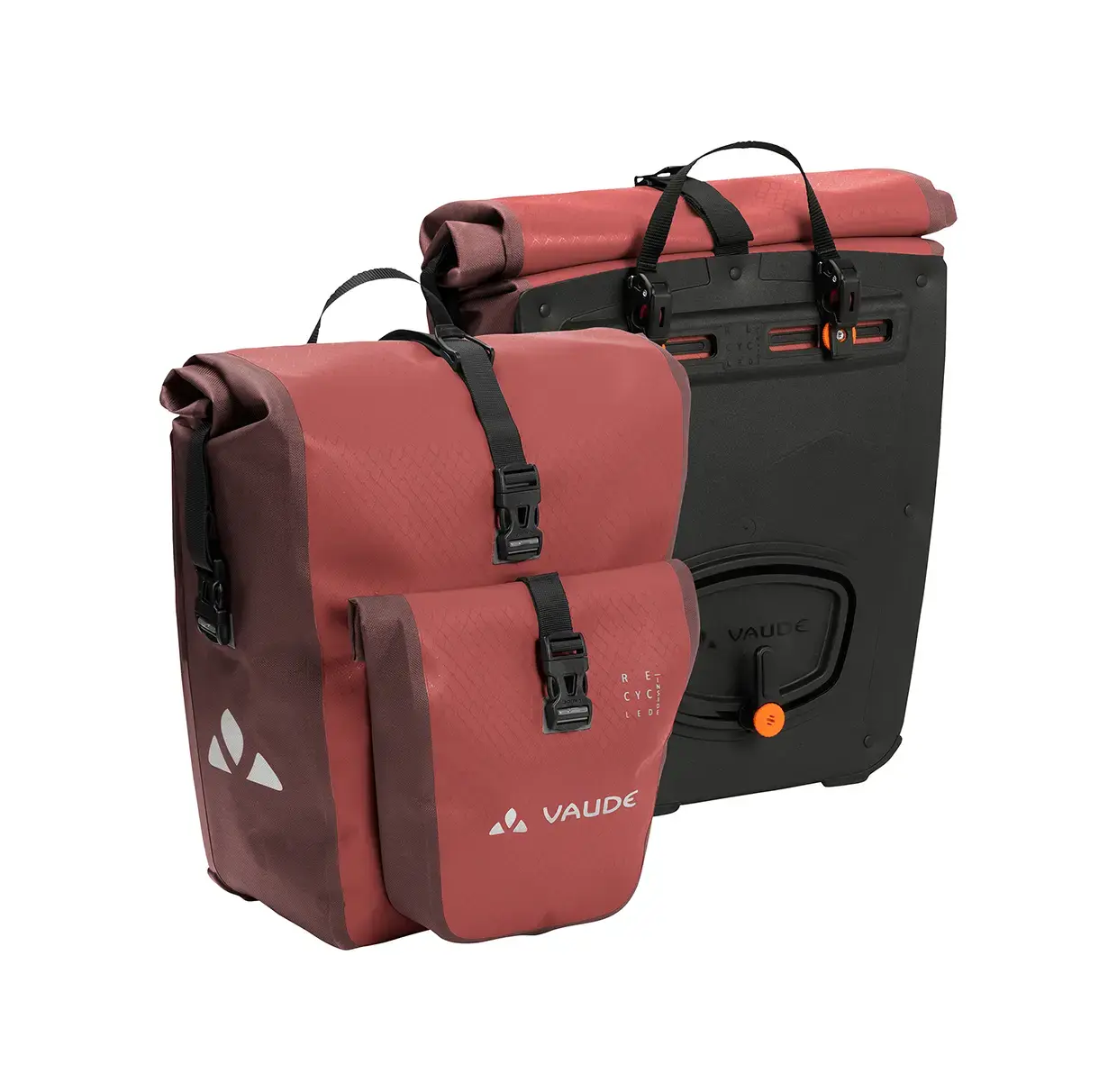 De Vaude Aqua Back Plus Recycled zijn fietstassen welke je eenvoudig kan monteren dankzij het QMR (Quick Mount Release) systeem. Deze kan je eenvoudig combineren met een hangslot zodat de fietstassen goed beveiligd op je fiets vastzitten. Met een inhoud van 2x 25,5 liter bieden de tassen erg veel opbergruimte. De fietstassen zijn waterdicht zodat je spullen goed beschermd zijn bij een eventuele regenbui. Het bevestigingssysteem past op bagagedragerbuizen met een diameter van 8-16 mm en is daarmee voor nagenoeg alle bagagedragers geschikt. Dankzij de afneembare schouderband kan je de fietstassen ook makkelijk meenemen op het moment dat je van de fiets afstapt en een stukje gaat wandelen. Voor een lage impact op het milieu zijn de tassen voor het grootste gedeelte gemaakt van gerecyclede materialen en zijn deze volledig PFC vrij.