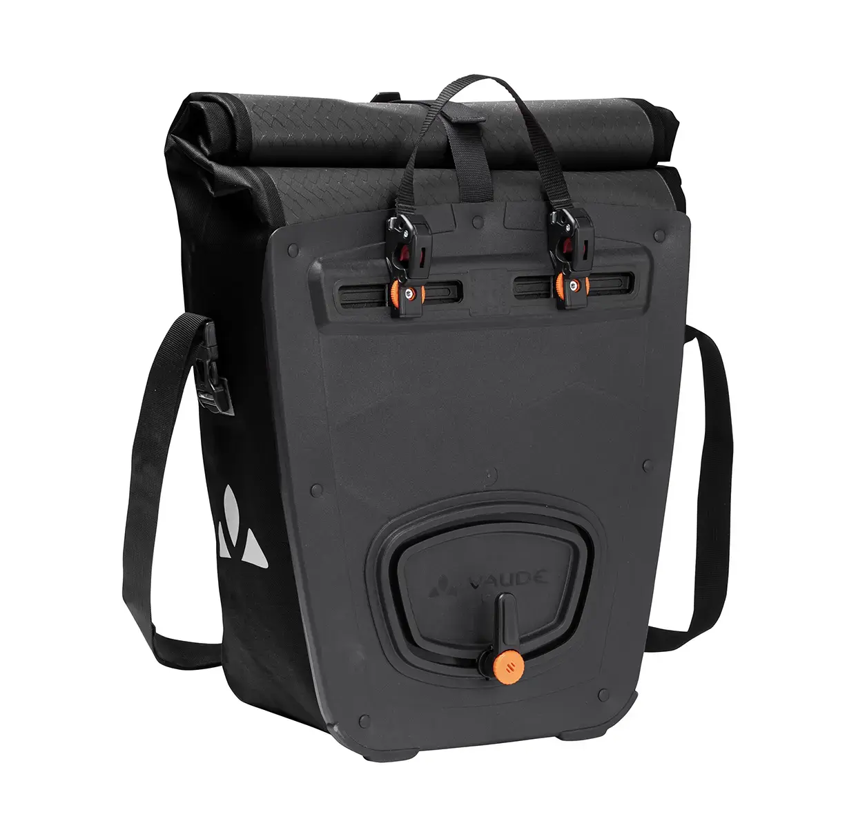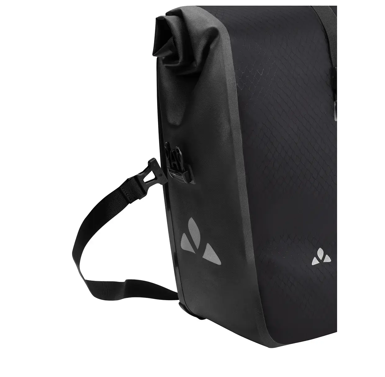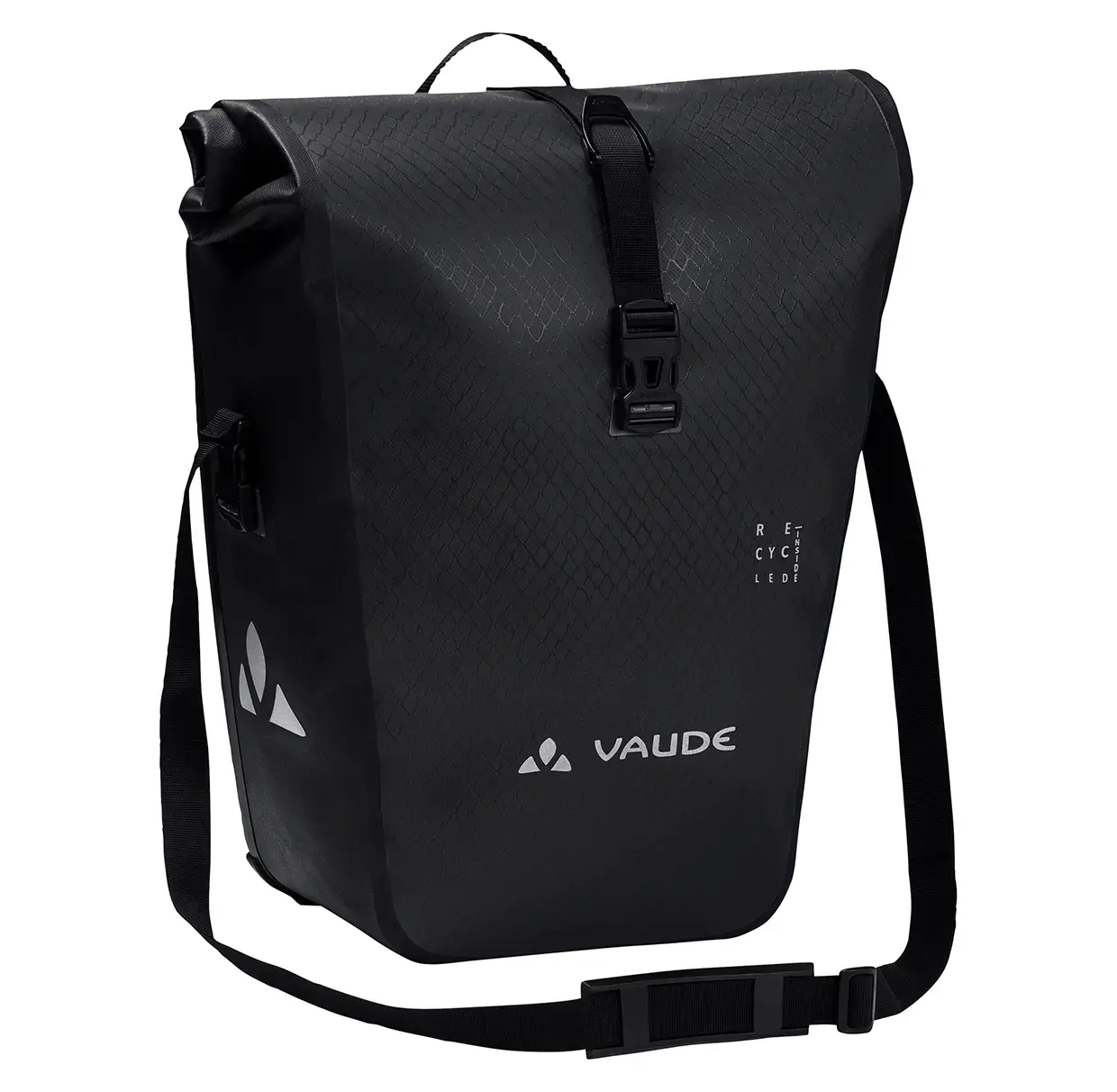 De VAUDE Aqua Back Single Recycled Achtertas heeft een inhoud van 24 liter en is perfect voor woon-werkverkeer of bikepacking. De achtertas is waterdicht door de gelaste constructie en de waterdichte rolsluiting. Hij is eenvoudig te monteren en demonteren met de gebruiksvriendelijke QMR 2.0-bevestiging. Als je je fiets parkeert en je wil je achtertas meenemen, hang je hem handig over je schouder met de afneembare schouderband. Door de reflecterende VAUDE-logo’s ben je ook goed als je bij schemerige omstandigheden op de fiets zit. Voor een lage impact op het milieu is de tas voor het grootste gedeelte gemaakt van gerecyclede materialen en is deze volledig PFC vrij.