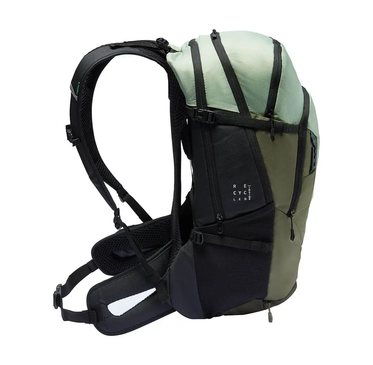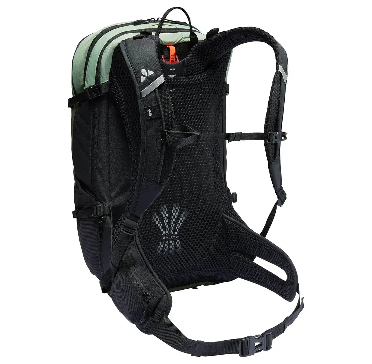 De Vaude Bike Alpin 25+5 Rugzak is een comfortabele rugzak en door zijn inhoud van 25 liter zeer geschikt voor meerdaagse tochten. De tas is namelijk nog eens uit te breide tot 30 liter. Je kunt je spullen goed organiseren in deze rugzak doordat hij beschikt over meerdere vakken: een groot compartiment, een voorvak en een vak onderaan. En een handige organizer in het hoofdvak voor bijvoorbeeld een kaart en tevens een aantal zijvakken, zoals een vak voor een minipomp. Aan de achterkant zit een ventilerend rugpaneel en heupband, waardoor de tas je rug niet direct raakt. Hierdoor gaat je rug niet zo snel zweten! Ook blijft hierdoor in combinatie met de heup- en borstband de tas stil op je rug zitten, waardoor je geen last van de tas hebt tijdens het fietsen en mountainbiken. De rugzak wordt geleverd inclusief regenhoes, dus ook bij een regenbui blijven je spullen droog. Wil je een fietshelm, fietspomp of fietslampje meenemen? Die kun je eenvoudig aan de rugzak verbinden! Ook is de tas te comprimeren middels de compressie straps aan de zijkant en is er een opening voor een waterzak.