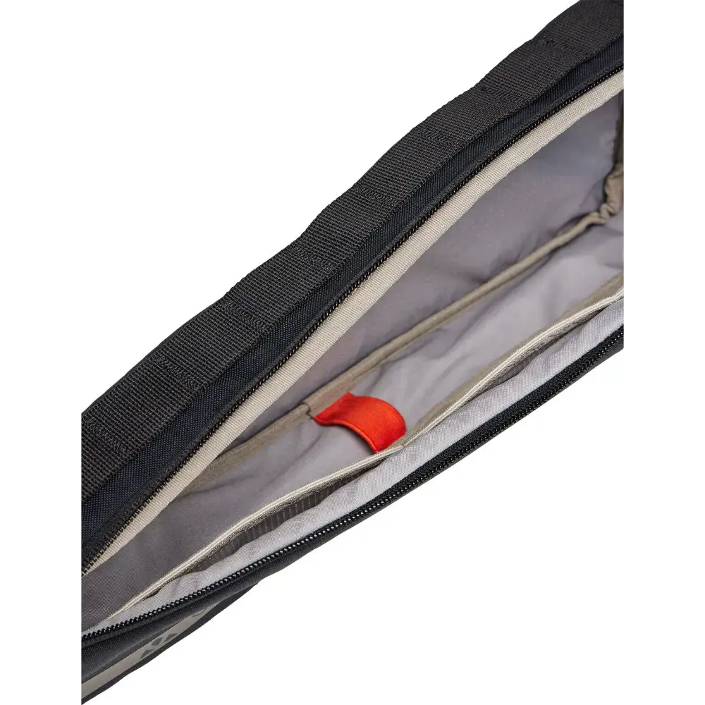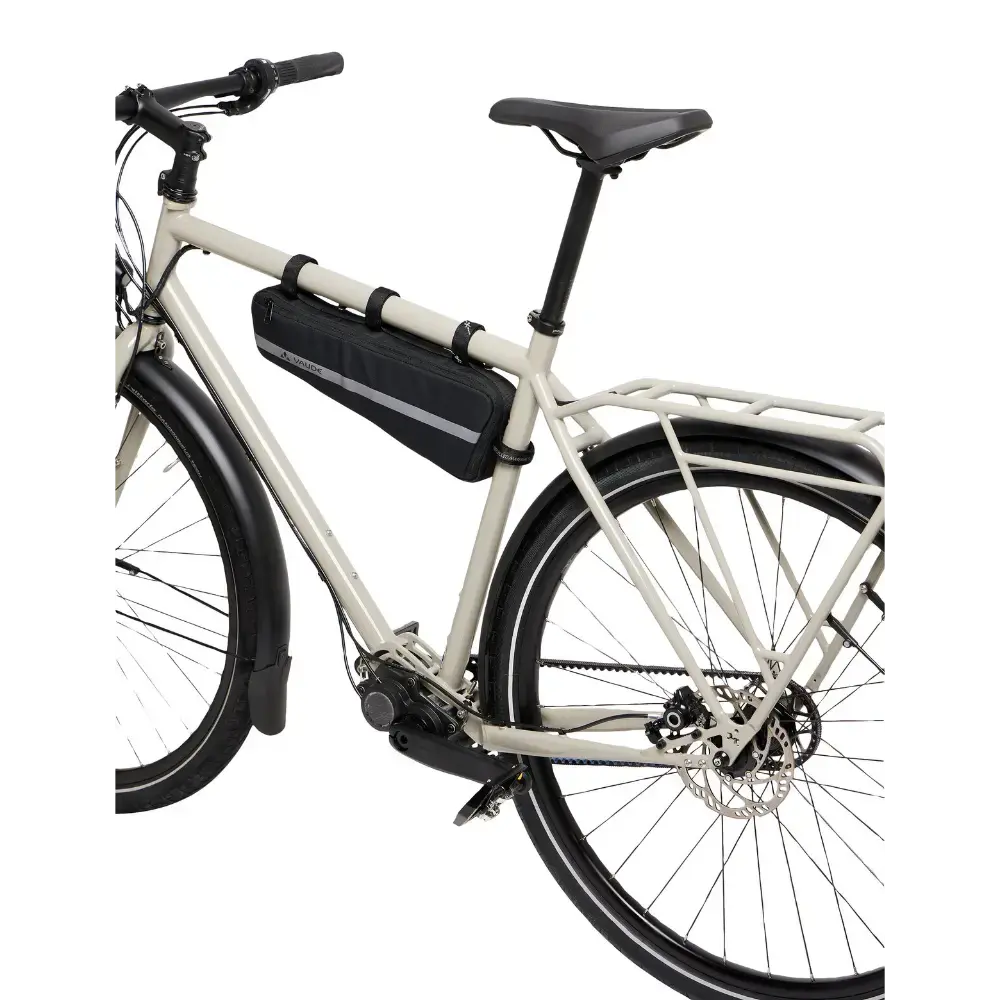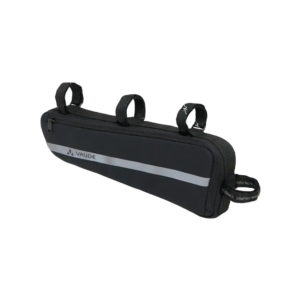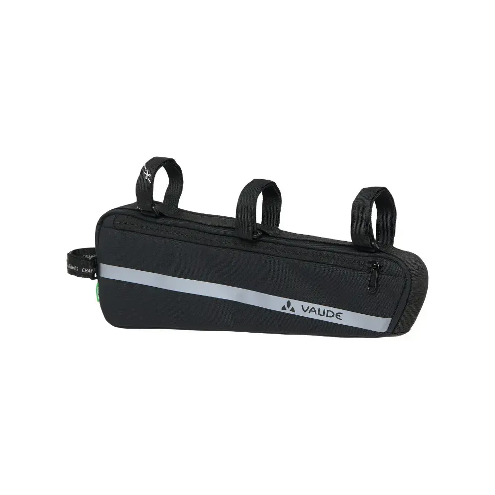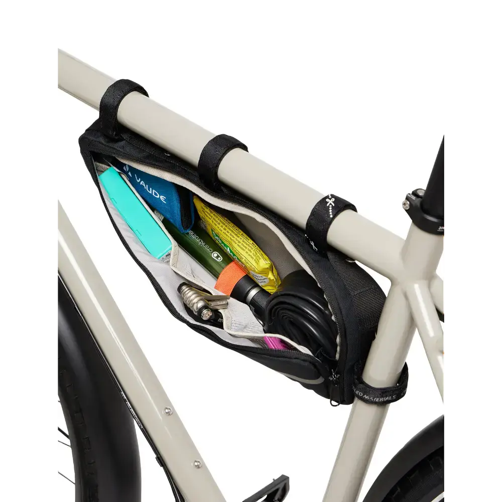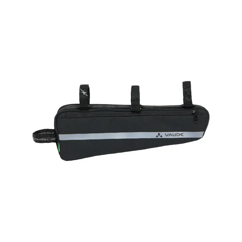 De Frame Bag XL Frametas van Vaude is een compacte en lichtgewicht opbergoplossing voor kleine frames. Met een inhoud van 1 liter biedt deze tas voldoende ruimte voor gereedschap, kleine onderdelen en persoonlijke spullen. De klittenbandbevestiging maakt het mogelijk de tas stevig tussen de bovenbuis en zadelbuis te monteren. Dankzij de reflecterende elementen ben je ook in het donker beter zichtbaar. Het duurzame ontwerp en het gebruik van gerecycled polyester onderstrepen de milieuvriendelijke productiefilosofie van Vaude.