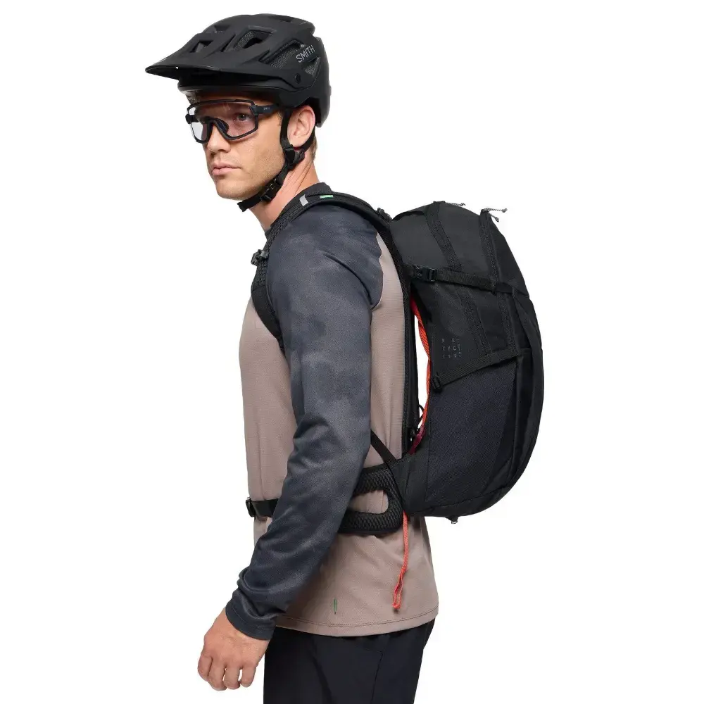 De TrailControl fietsrugzak met 20+ liter beschikt over het Aeroflex Control Systeem. Met dit veersysteem heb je een geventileerde rug bij het bergop fietsen. Trek vervolgens aan twee lussen bij de ingang van de trail en je hebt een contactrug en het zwaartepunt comfortabel dicht bij je lichaam. De ruglengte is volledig verstelbaar. Opbergruimte wordt geboden door een groot hoofdcompartiment, gaasvakken aan de zijkanten en een ritsvak op de rechter heupgordel. Als de helm op je hoofd zit, kun je ook andere spullen in het helmvak meenemen. Organisatiemogelijkheden omvatten een vak voor gereedschap, een organizer en een sleutelring. De rugzak is voorzien van compressieriemen aan de zijkant, een borst- en heupgordel en reflecterende elementen. Een regenhoes is inbegrepen. Het materiaal van de TrailControl fietsrugzak is water- en vuilafstotend dankzij Eco Finish.