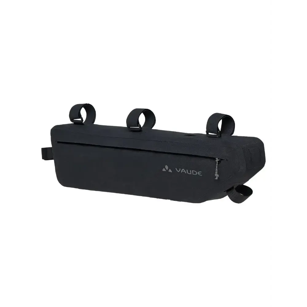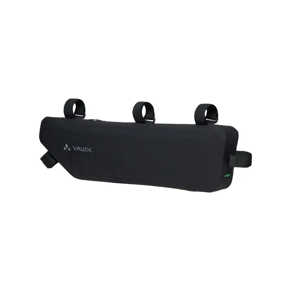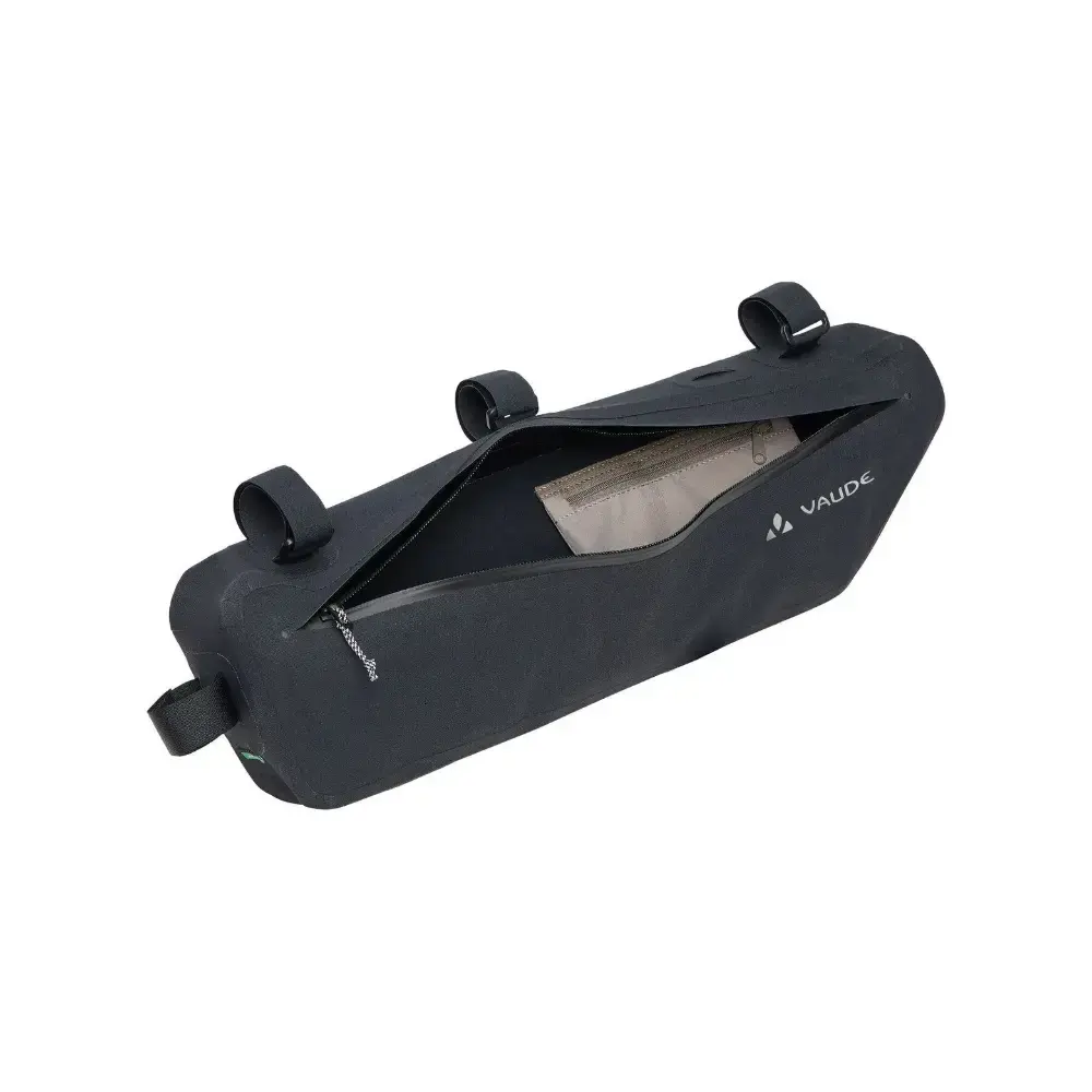 Met een lengte van vijftig centimeter en een volume van vijf liter is de Trailframe L frametas zeer royaal bemeten en slikt hij met gemak zwaardere en langere uitrusting op, zoals tentstokken of boodschappen, zonder het rijgedrag van de fiets te beïnvloeden. De waterdicht gelaste tas wordt met stevige klittenbandriemen aan de balhoofdbuis, bovenbuis en zitbuis bevestigd. Het slanke ontwerp biedt voldoende knieruimte, terwijl een interne klittenbandsluiting helpt om de inhoud vast te zetten en te voorkomen dat de tas uitpuilt. De organizer met rits in het hoofdvak scheidt kleine spullen van grotere uitrusting, en de zeer lange, waterdichte hoofdrits maakt in- en uitpakken eenvoudig. Om de volledige framedriehoek optimaal te benutten, kan de Trailframe L (randlengte 14 cm) worden gecombineerd met de Trailframe M (randlengte 20 cm) tot een grote bikepacking-combinatie van acht liter.