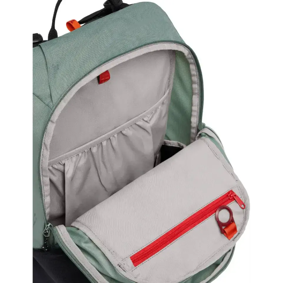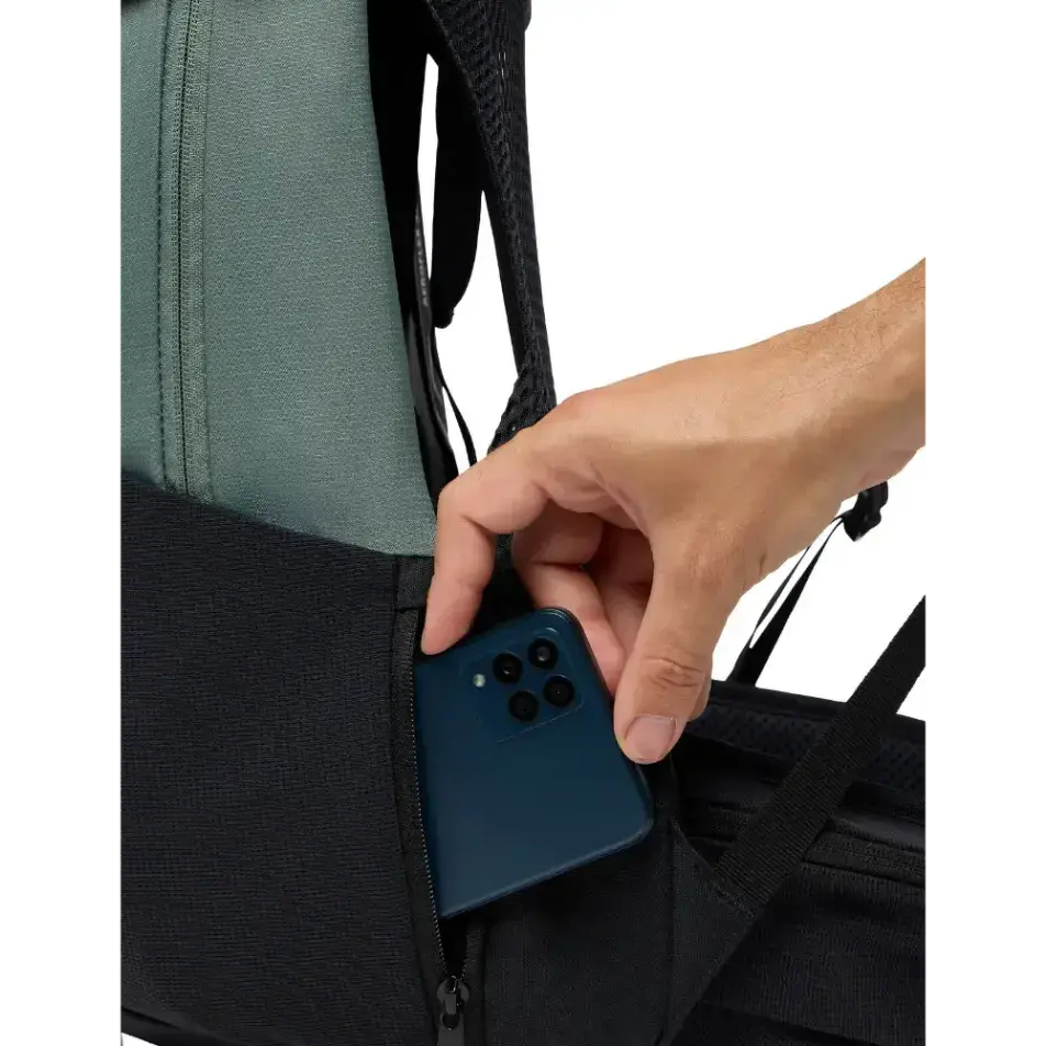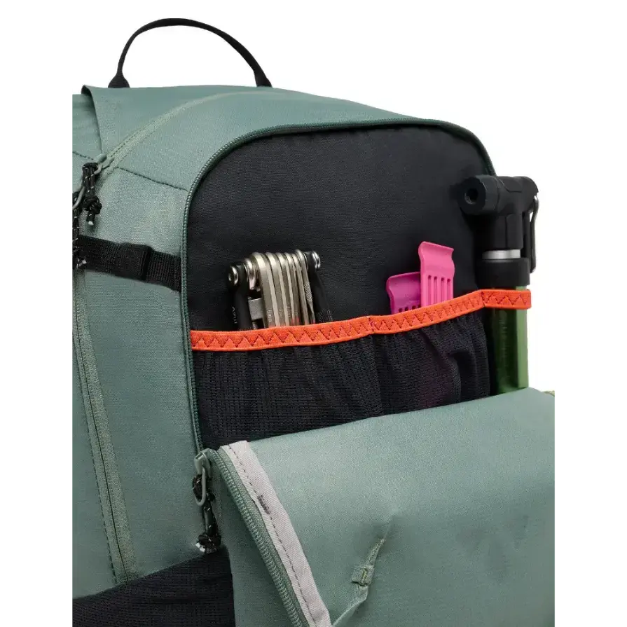De Vaude Trailvent 15 Fietsrugzak is de ideale metgezel voor spontane mountainbiketochten. Deze rugzak biedt een uitstekend ventilerend Aeroflex 3D-rugsysteem en garandeert langdurig draagcomfort dankzij de traploos verstelbare ruglengte, goed gepolsterde heup- en schouderbanden en een borstband met drinkslanghouder. De doordachte vakindeling biedt in het hoofdvak ruimte voor een hydratatiezak, een ritsvak voor waardevolle spullen en een sleutelhouder. Het voorvak biedt plek aan een fietspomp, gereedschap en een reserveband. Dankzij de zijdelingse compressieriemen en mesh zijvakken is alle bagage veilig en snel toegankelijk. Een helmhouder, achterlichthouder, grote reflecterende elementen en een geïntegreerde regenhoes maken de Trailvent 15 compleet. Het Vaude Green Shape-label staat voor een milieuvriendelijk, functioneel product van duurzame materialen.