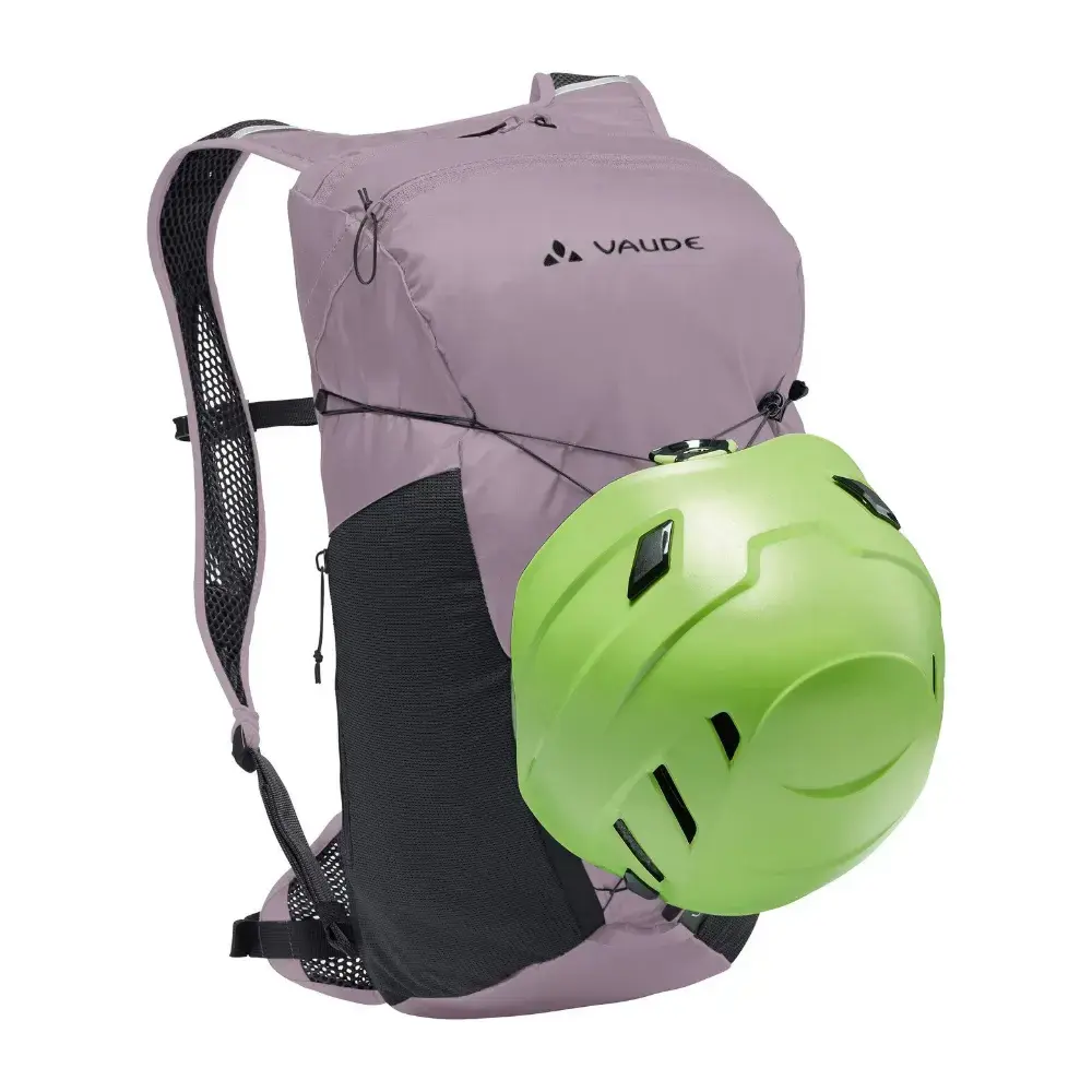 - Trekkoordsysteem aan de buitenkant met drievoudige functie: voor compressie, als helmhouder en al extra bevestigingsmogelijkheid voor bijvoorbeeld een jas