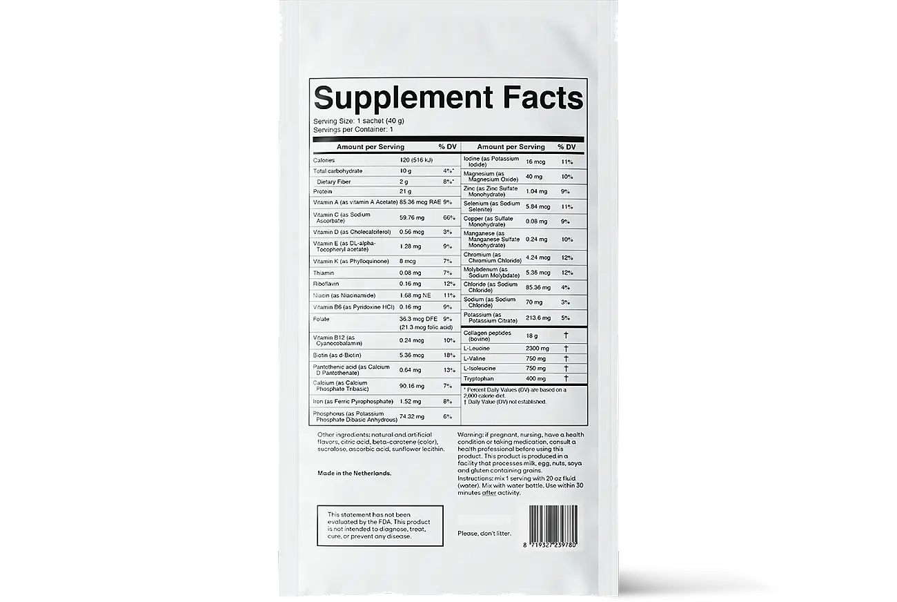 Ingrediënten:Collageenpeptiden (rund), maltodextrine, BCAA instant (2:1:1), inuline, vitamine/mineralenmengsel, aromamengsel, voedingszuur: citroenzuur, L-Leucine, L-Tryptofaan, natuurlijke kleurstof: bètacaroteen, zoetstof: sucralose, ascorbinezuur & zonnebloemlecithine.