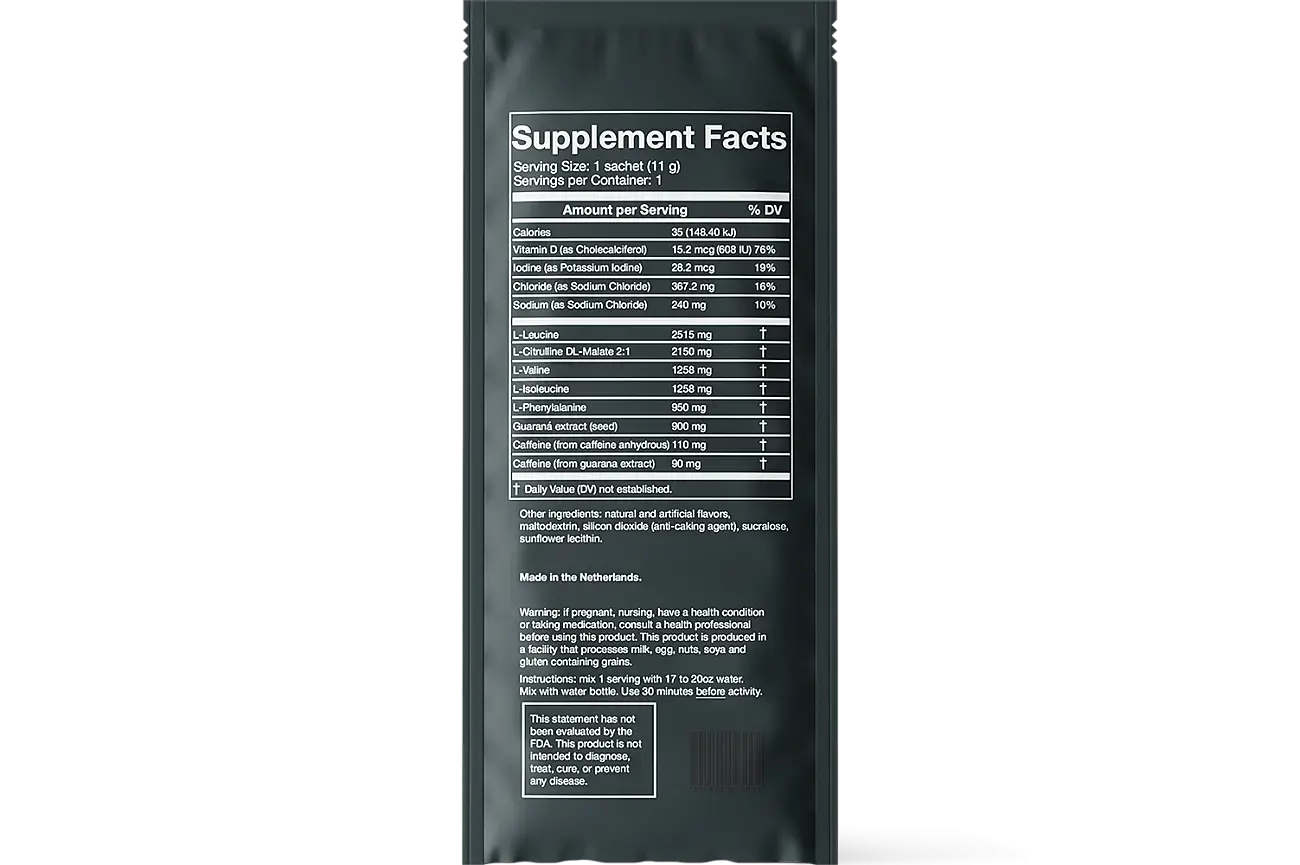 Ingrediënten:Natuurlijke en kunstmatige smaken, maltodextrine, siliciumdioxide (antiklontermiddel), sucralose, zonnebloemlecithine, L-Leucine (2515 mg), L-Citrulline DL-Malaat 2:1 (2150 mg), L-Valine (1258 mg), L-Isoleucine (1258 mg), L-Fenylalanine (950 mg), Guarana-extract (zaad) (900 mg), Cafeïne (watervrij) (110 mg), Cafeïne (uit guarana-extract) (90 mg), Vitamine D (als Cholecalciferol) (15.2 mcg), Jodium (als Kaliumjodide) (28.2 mcg), Chloride (als Natriumchloride) (367.2 mg), Natrium (als Natriumchloride) (240 mg).