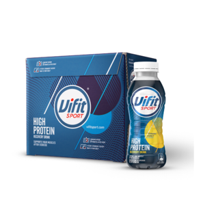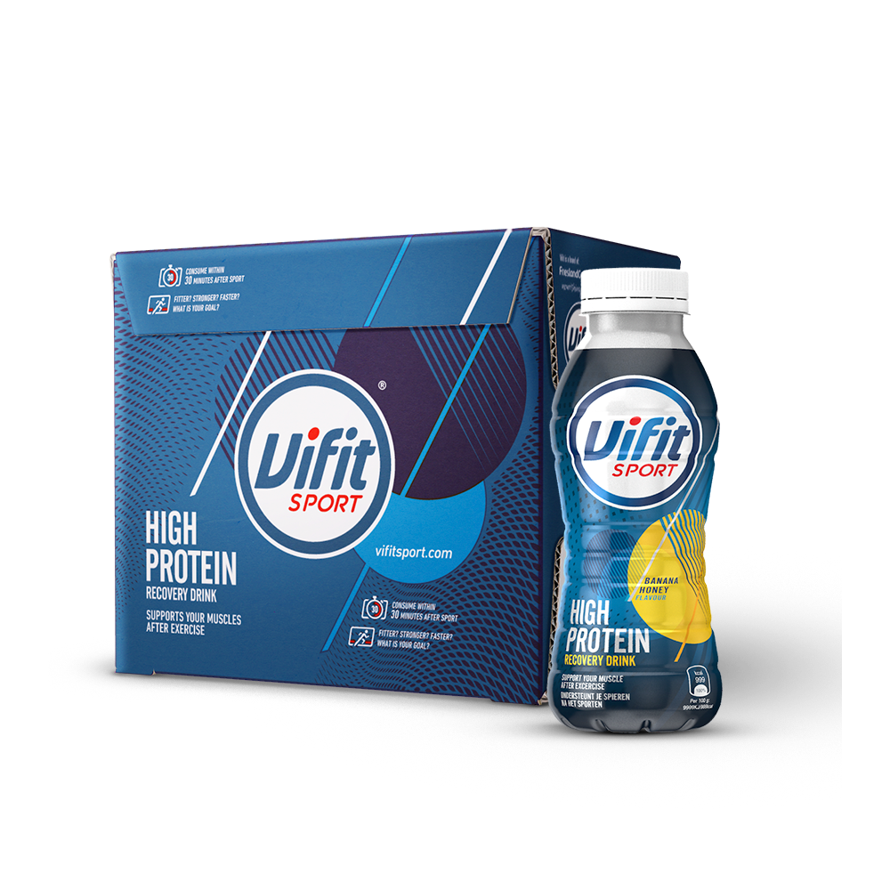De Vifit Recovery Drank Banaan/Honing is de perfecte hersteldrank voor na het sporten. De sportdrank bevat veel eiwitten (20 gram per portie!) waardoor je spieren optimaal kunnen herstellen. We raden aan om de drank binnen 30 minuten na het sporten in te nemen en is zowel gekoeld als ongekoeld lekker om te drinken. Bovendien neem je het flesje makkelijk mee in je sporttas! Naast proteïne zit er in Vifit Sport Recovery Drink ook vitamine D, kalium, magnesium en van nature calcium. Deze vitamine en mineralen dragen bij aan het functioneren van je spieren.