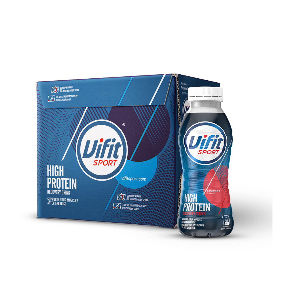 De Vifit Recovery Drank Guarana is de perfecte hersteldrank voor na het sporten. De sportdrank bevat veel eiwitten (20 gram per portie!) waardoor je spieren optimaal kunnen herstellen. We raden aan om de drank binnen 30 minuten na het sporten in te nemen en is zowel gekoeld als ongekoeld lekker om te drinken. Bovendien neem je het flesje makkelijk mee in je sporttas! Naast proteïne zit er in Vifit Sport Recovery Drink ook vitamine D, kalium, magnesium en van nature calcium. Deze vitamine en mineralen dragen bij aan het functioneren van je spieren.