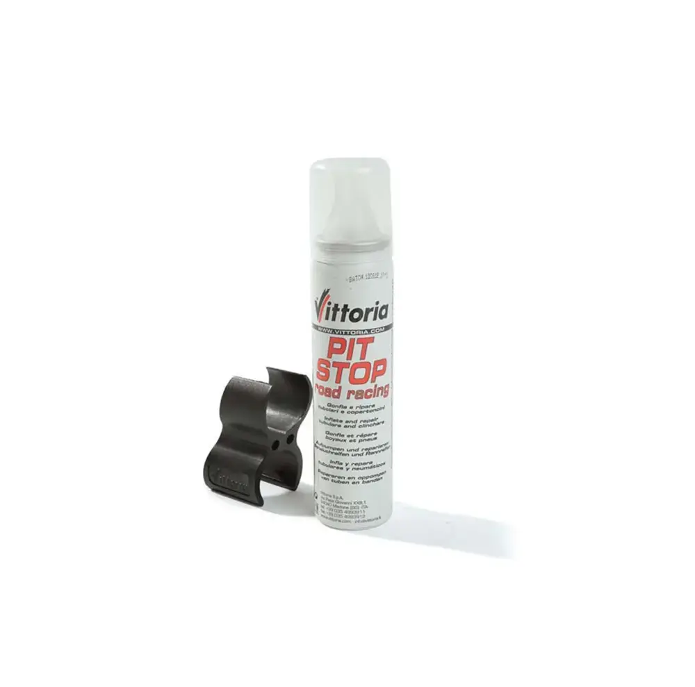 Een lekke band onderweg? Met de Vittoria Pitstop Race met clip is dit zo verholpen! Met behulp van dit latexschuim worden klein gaatjes in de band gerepareerd, waarna je de raceband binnen enkele seconden opblaast tot maximaal 6 bar, terwijl een tube zelfs tot 6,5 bar op te blazen is. Deze uitvoering van 75 milliliter is voldoende om één band te repareren. Je neemt de spray gemakkelijk mee op je racefiets dankzij de meegeleverde houder die je aan het zadel vastklikt je gemakkelijk met je mee tijdens jouw fietsritten.