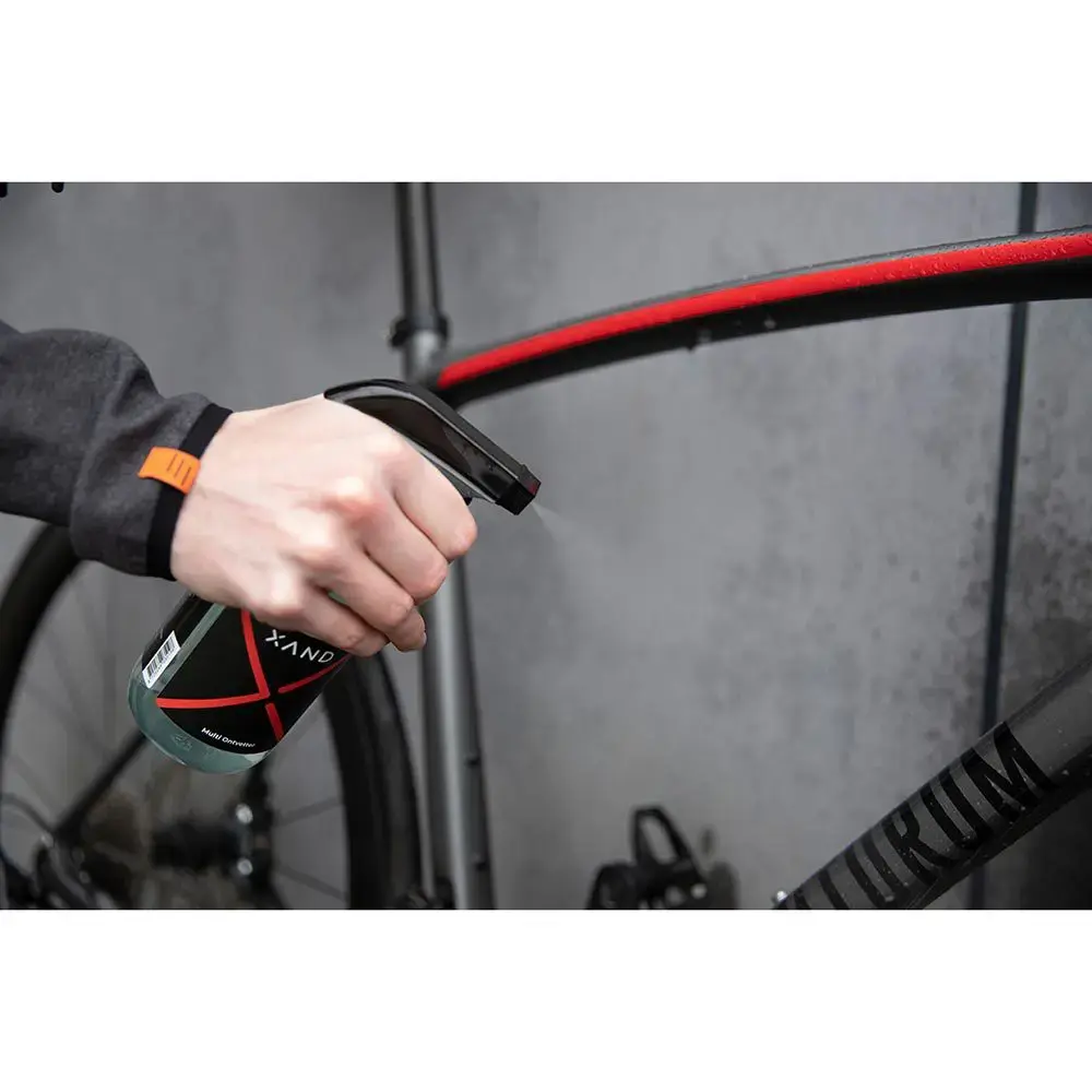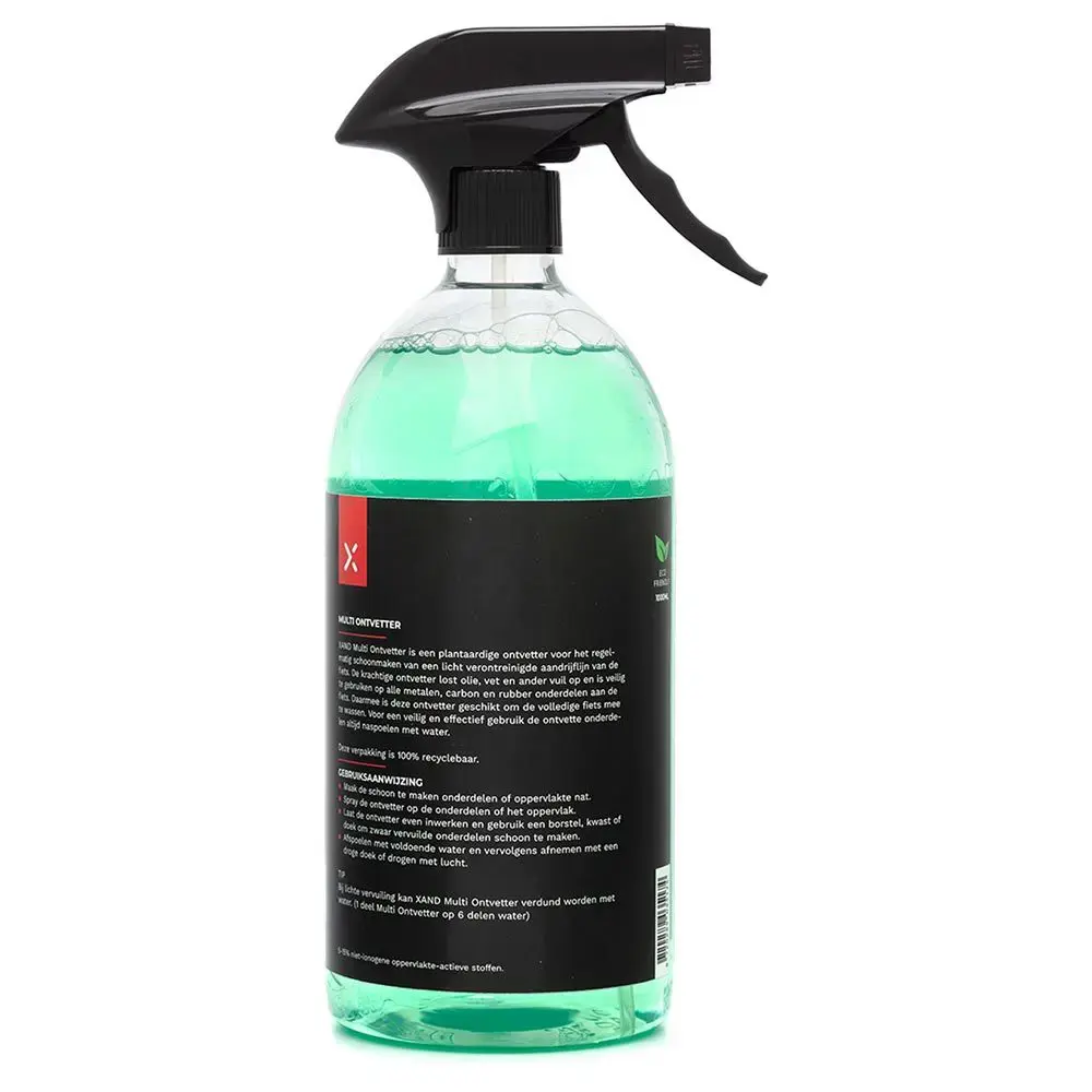 XAND Multi Reiniger is een krachtig plantaardig schoonmaakmiddel met een sterke ontvettende werking. Daarmee is deze reiniger geschikt om de volledige fiets mee te wassen. Het weekt eenvoudig het vuil op het frame los en is zeer geschikt voor het schoonmaken van een licht verontreinigde aandrijflijn van de fiets. De Multi Reiniger lost olie, vet en ander vuil op en is veilig te gebruiken op alle metalen, carbon en rubber onderdelen aan de fiets. Voor een veilig en effectief gebruik de ontvette onderdelen altijd naspoelen met water. In de meegeleverde sprayflacon kan de XAND Multi Reiniger verdund worden om dit te gebruiken op minder vervuilde onderdelen. (1 deel Multi Reiniger op 6 delen water)
