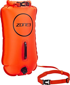 Deze handige Zone3 Zwem Buoy/Drybag drijft en is mee te nemen tijdens het zwemmen. Vul de Drybag met de spullen die je mee wil nemen, rol hem op en sluit de zak. Vervolgens is het mogelijk de zak op te blazen zodat deze als een boei fungeert. Met de heupband is de boei mee te slepen tijdens het zwemmen. Als de tas plat ligt, meet de binnenkant van de tas 50 cm x 35 cm en heeft een inhoud van 28 liter, wat voldoende ruimte biedt voor droge kleding, handdoeken, slippers enz.
