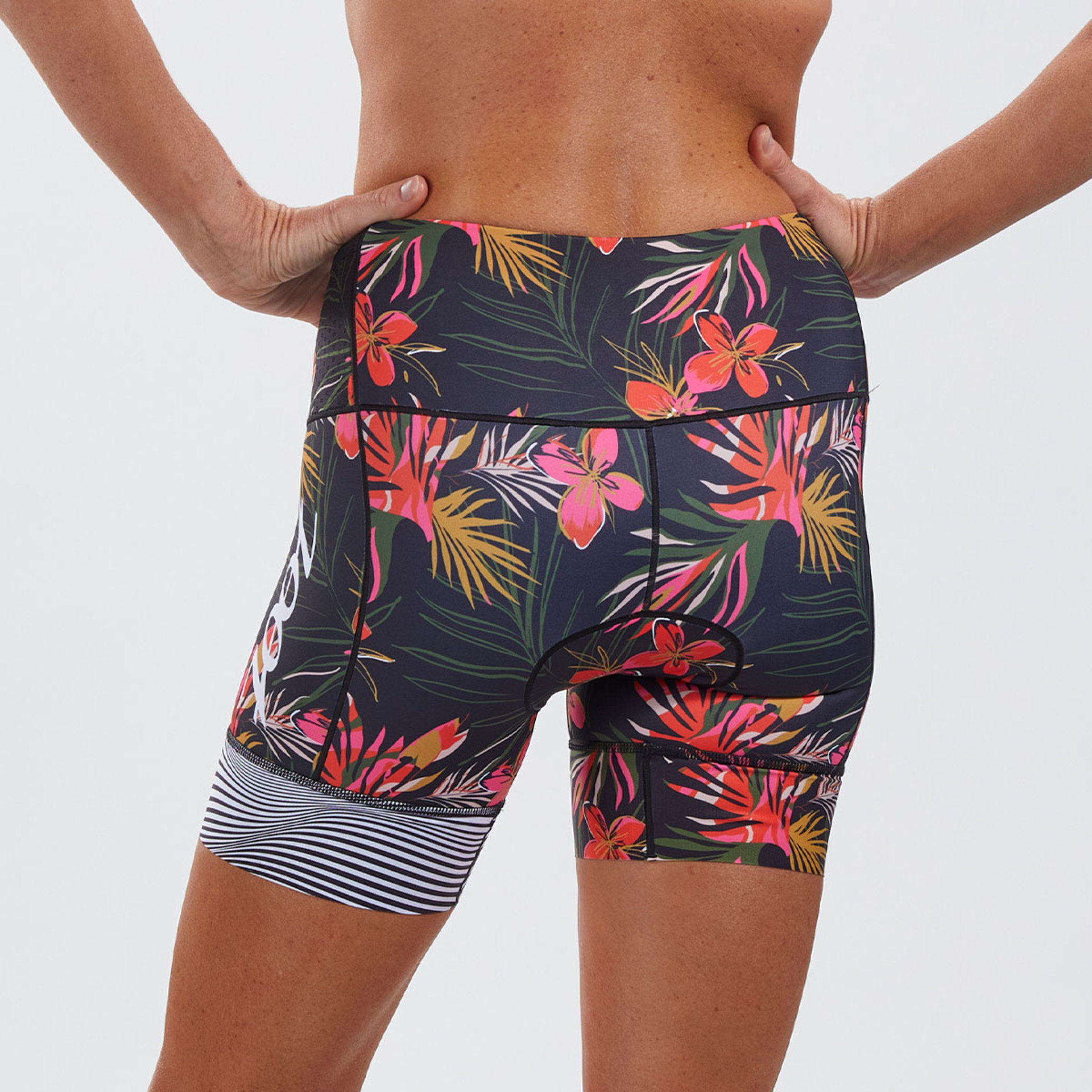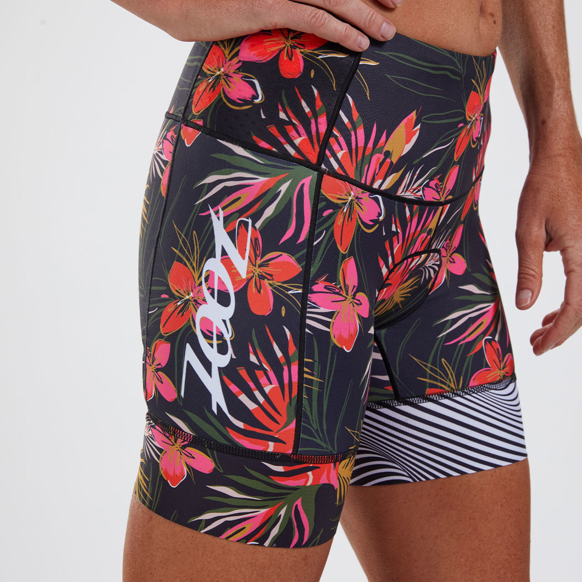 Deze Zoot LTD Tri 6" Triathlon Broek combineert functie en mode uitstekend met elkaar. De opvallende print zorgt ervoor dat je al van verre bent te herkennen. Deze Waikoloa uitvoering is geïnspireerd op het legendarische slopende fietsparcours van het WK in Kona, Hawaii, waar de plaats Waikoloa ligt. De gebruikte PRO CARBON TRI zeem zorgt voor de nodige comfort. Deze is speciaal ontworpen om comfort te bieden in de aerodynamische houding op een tijdritfiets. De zeem gaat daarnaast niet in de weg zitten tijdens het zwemmen en hardlopen. De broek is ontworpen met een brede, flatterende platte tailleband met gemakkelijk toegankelijke zijzakken voor een gel of sportreepje.